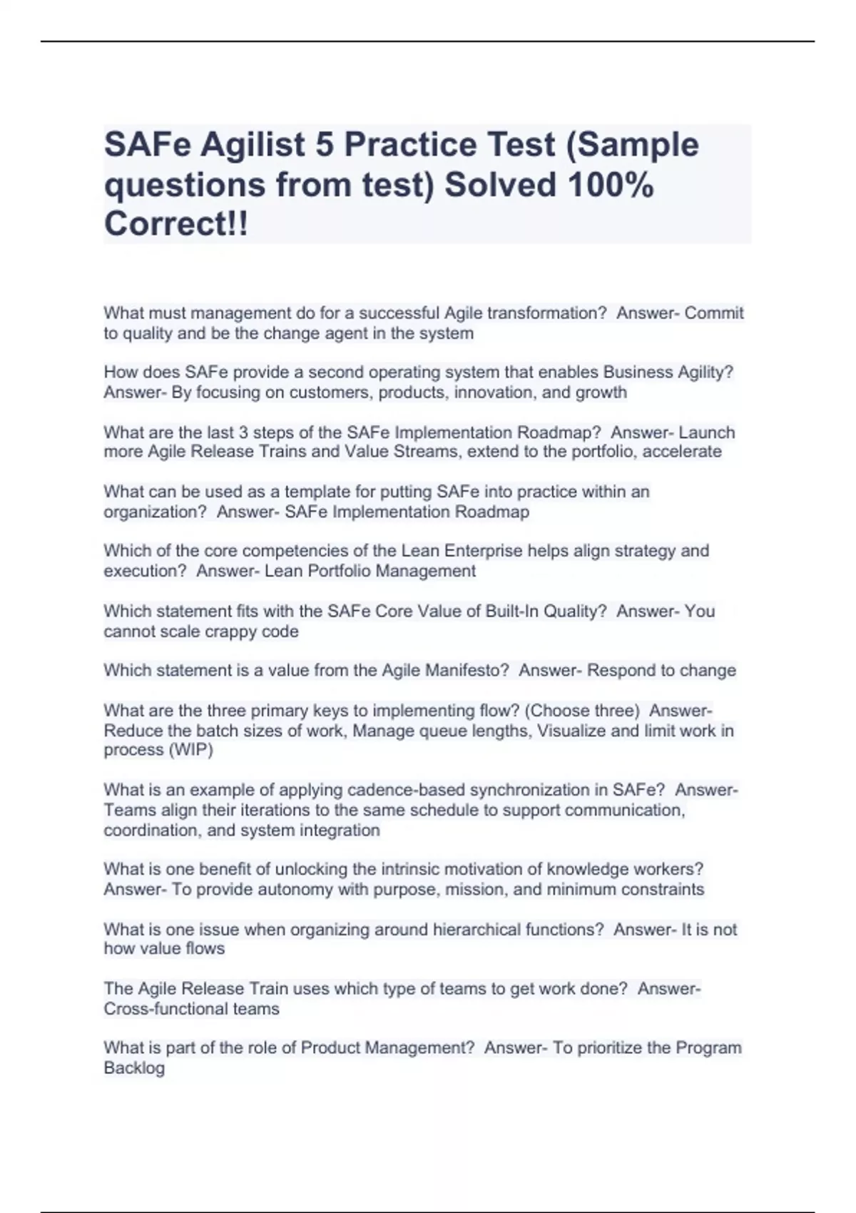 SAFe Agilist 5 Practice Test (Sample questions from test) Solved 100% Correct!!