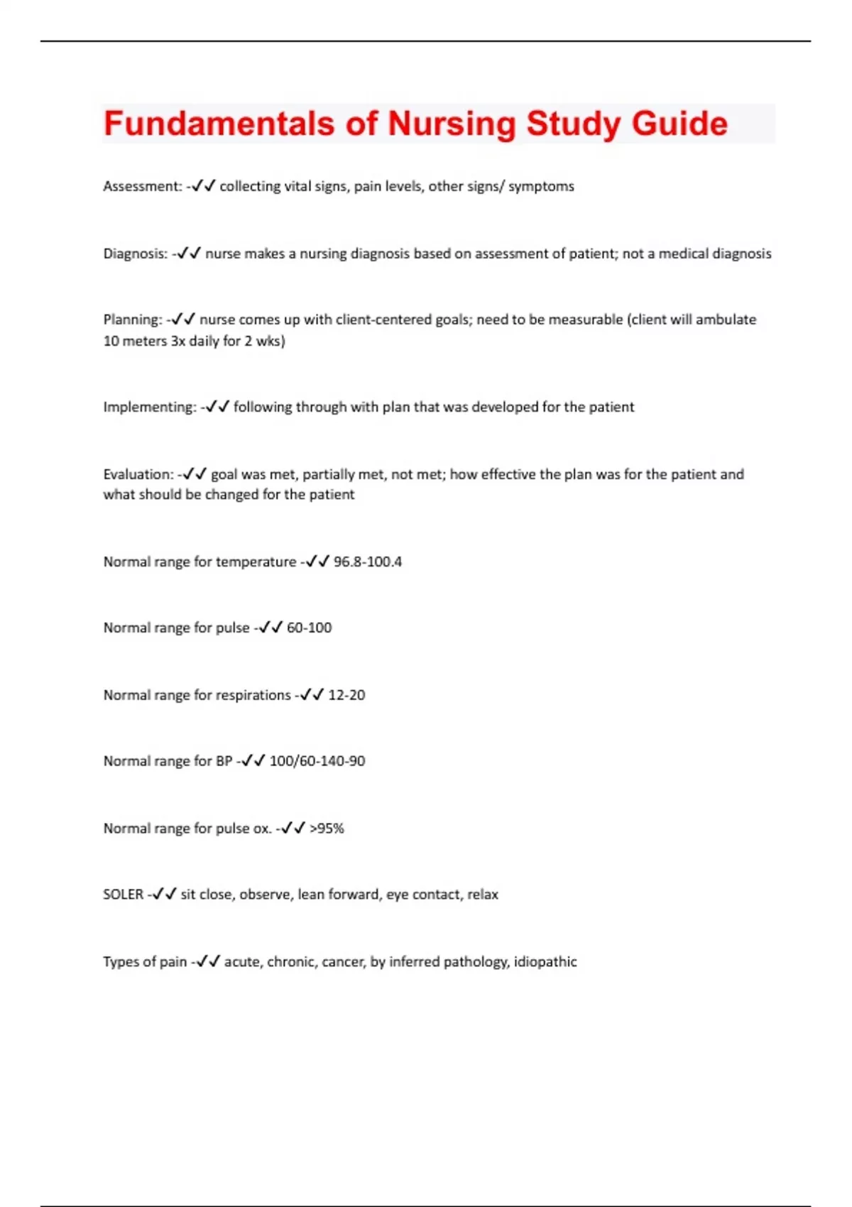 Assessment: - collecting vital signs, pain levels, other signs/ symptoms Diagnosis: - nurse makes a nursing diagnosis based on assessment of patient; not a medical diagnosis Planning: - nurse comes up with client-centered goals; need to be measurable (client will ambulate 10 meters 3x daily for 2 wks) Implementing: - following through with plan that was developed for the patient Evaluation: - goal was met, partially met, not met; how effective the plan was for the patient and what should be changed for the patient Normal range for temperature - 96.8-100.4 Normal range for pulse - 60-100 Normal range for respirations - 12-20 Normal range for BP - 100/60-140-90 Normal range for pulse ox. - >95% SOLER - sit close, observe, lean forward, eye contact, relax Types of pain - acute, chronic, cancer, by inferred pathology, idiopathicPain threshold - level of stimulus needed to produce the perception of pain