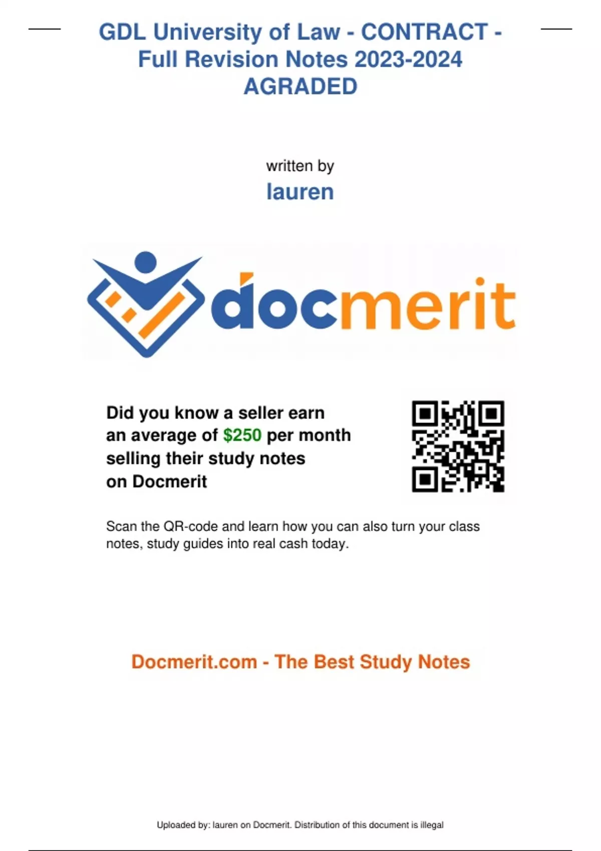 Uploaded by: lauren on Docmerit. Distribution of this document is illegal GDL University of Law - CONTRACT - Full Revision Notes 2023 -2024 AGRADED Contents Contents 1 WS1 Agreement & Contractual Intentions 2 WS2 Consideration 5 WS 3 Contents of a Contract & Exemption Clauses 8 WS4 Remedies for Breach of Contract - Damages 11 WS5 Termination & Remedies 14 WS6 Frustration & Contractual Certainty 17 WS7 False Preliminary Statements 19 WS8 Duress 22 WS9 Undue Influence 23 WS1 Agreement & Contractual Intentions Offer - Offer defined by Prof Treital as ‘an expression of willingness to contract on certain terms, made with the intention that it shall become binding as soon as it is accepted’. - Smith v Hughes : Courts use primarily objective test to decide if agreement has been made, considering what a reasonable person would have thought. - Allied Marine Transport v The Leonidas : while test is primarily objective as to offeror’s conduct, court ruled that the offeree must believe that the offeror actually intended to make an offer (subjective). Invitation to Treat - A preliminary statement which invites negotiation. - Pharmaceutical Society of Great Britain v Boots Cash Chemists and Fisher v Bell: Goods on display in supermarkets and self-service shops are regarded as invitations to treat, not offers. Customer offers to buy the goods when he presents them at the payment point. - Partridge v Crittenden : Adverts are generally considered invitations to treat - Williams v Carwadine : Adverts involving a reward are offers, as there is an intention to be bound by the reward as soon as the information is given - Carlill v Carbolic Smoke Ball: Advertisements constitute an offer to the world if there is a clear intention to be bound - Requests for tenders are usually invitations to treat but there are exceptions to this. - Harvela Investments Ltd v Royal Trust Company of Canada Ltd: parties invited to tender (i.e. put in offers) for shares and were promised that the highest bid/offer would be accepted. This was held to be an offer of unilateral contract to sell to highest bidder. - Blackpool & Fylde Aero Club v Blackpool Borough Counci l: council had impliedly promised to consider all tenders, creating a unilateral contract Bilateral Contract - arises when one party makes a promise in return for a promise from the other party Unilateral Contract - Promise in return for an act and is one sided, eg. an offer of a reward (Williams v Cawardine ) and ‘without reserve’ auctions Auctions - s57(2) Sale of Goods Act 1979: sale by auction complete on the fall of the hammer (the acceptance). The bids are offers which can be withdrawn at any time before acceptance. Call for bids by auctioneer is invitation to treat. - Auctioneer acts as an agent for the owner so when the auctioneer accepts the bid, it forms a bilateral contract between the owner and bidder. - s57(3) SGA 1979 refers to ‘reserve price’, the lowest price which the auctioneer may accept, agreed with owner. - Barry v Davies : if a lot is advertised as being ‘without reserve’ then the auctioneer is promising to sell to the highest bidder (a unilateral contract). Termination of Offer - May be terminated by revocation, rejection, or lapse of time. Revocation - General rule is offer can be withdrawn any time before acceptance. After acceptance, irrevocable. Exceptions: - Routledge v Grant : A promise to keep an offer open is not binding if it is a gratuitous promise (given for free) - Mountford v Scott : promise to keep an offer open is binding if consideration is given (here paid £1) - Byrne v Van Tienhoven : revocation must be communicated to the offeree. Withdrawal may be effective if offeree moved address without notifying offeror, or chose not to read the letter (Prof Treital) - Carlill v Carbolic Smoke Ball: To revoke offers made to the public, the revocation must be through the same channel the offer was made - The Brimnes : To revoke offers made to businesses, the court will decided when the revocation was likely to be effective, depending on reasonable expectations, e.g. if sent during business hours, expectation is that it will be read immediately - Dickinson v Dodds : Revocation can be communicated through a reliable third party