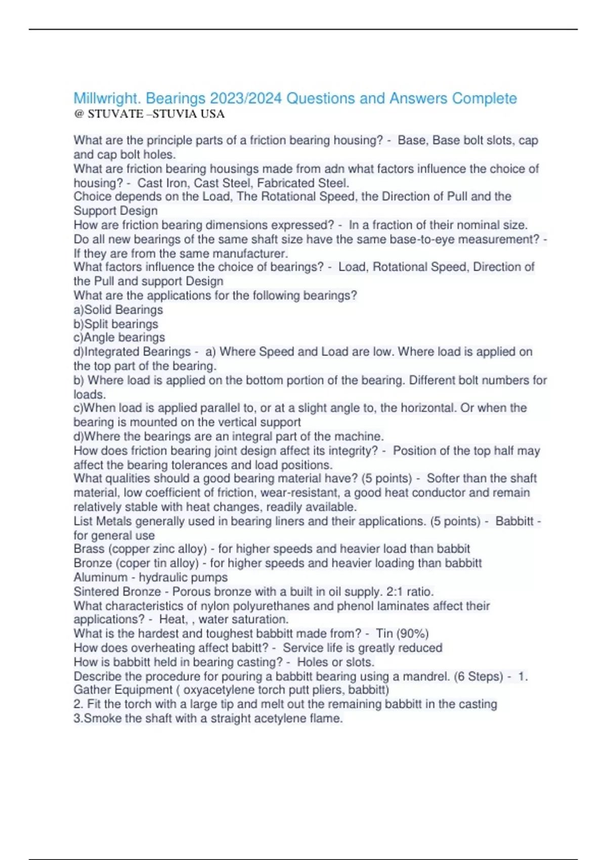 Millwright. Bearings 2023/2024 Questions and Answers Complete @ STUVATE –STUVIA USA What are the principle parts of a friction bearing housing? - Base, Base bolt slots, cap and cap bolt holes. What are friction bearing housings made from adn what factors influence the choice of housing? - Cast Iron, Cast Steel, Fabricated Steel. Choice depends on the Load, The Rotational Speed, the Direction of Pull and the Support Design How are friction bearing dimensions expressed? - In a fraction of their nominal size. Do all new bearings of the same shaft size have the same base-to-eye measurement? - If they are from the same manufacturer. What factors influence the choice of bearings? - Load, Rotational Speed, Direction of the Pull and support Design What are the applications for the following bearings? a)Solid Bearings b)Split bearings c)Angle bearings d)Integrated Bearings - a) Where Speed and Load are low. Where load is applied on the top part of the bearing. b) Where load is applied on the bottom portion of the bearing. Different bolt numbers for loads. c)When load is applied parallel to, or at a slight angle to, the horizontal. Or when the bearing is mounted on the vertical support d)Where the bearings are an integral part of the machine. How does friction bearing joint design affect its integrity? - Position of the top half may affect the bearing tolerances and load positions. What qualities should a good bearing material have? (5 points) - Softer than the shaft material, low coefficient of friction, wear-resistant, a good heat conductor and remain relatively stable with heat changes, readily available. List Metals generally used in bearing liners and their applications. (5 points) - Babbitt - for general use Brass (copper zinc alloy) - for higher speeds and heavier load than babbit Bronze (coper tin alloy) - for higher speeds and heavier loading than babbitt Aluminum - hydraulic pumps Sintered Bronze - Porous bronze with a built in oil supply. 2:1 ratio. What characteristics of nylon polyurethanes and phenol laminates affect their applications? - Heat, , water saturation. What is the hardest and toughest babbitt made from? - Tin (90%) How does overheating affect babitt? - Service life is greatly reduced How is babbitt held in bearing casting? - Holes or slots. Describe the procedure for pouring a babbitt bearing using a mandrel. (6 Steps) - 1. Gather Equipment ( oxyacetylene torch putt pliers, babbitt) 2. Fit the torch with a large tip and melt out the remaining babbitt in the casting 3.Smoke the shaft with a straight acetylene flame. 4.Put a putty dam around the shaft and bearing 5. Hold the babbitt with the pair of pliers 6. Melt it into the bearing with the torch. What must be checked when fitting a bearing? (4 points) - surface finish area of contact, running clearance, lubrication entry, and grooves Describe the purpose of tinning. - To secure a thin skin of babbitt to a metallic backing. Describe the tools used to fit a friction bearing. - Scraper, files, groove chisels. Describe procedure for fitting a bearing. - 1. Chamfer the top edges or cut an oil groove 2. check bearing for contact by coating mandrel in bluing and rotating mandrel 3. Shave down high spots indicated by bluing Describe the procedure fro shimming a bearing to the correct amount of clearance. - Insert shims, make sure they do not make contact with the shaft or the chamfer. Tighten bolts to specs and rotate the shaft. Add shims or realign the cap. Describe the procedure for checking bearing clearance with a dial indicator, Pastigage and lead wire. (3 points) - 1. Place indicator on both ends of the shaft and adjust to acquire an even reading. 2. Insert plastigage and tight cap to proper torque and measure width to determine clearance. 3.Same way as plastigage Described how preformed bearings are installed and held in place. - Press preformed bearing into housing with the cap. Or press fit Describe procedure for installing bushings. - Pressure fit or crushed into housing Describe how thrust is controlled with plain bearings for both low and high speed applications. - Oil wedges. Describe radial and axial load. - Radial is horizontal load, axial is vertical. Describe the basic design of Kingsbury bearings. - Faces have a minor pivoted shoes and oil is injected to so during operation the shaft is centered in clearance accurately. What styles do kingsbury bearings come in? (2 points) - Fixed pad and floating or tilting pads. What are the merits of anit-friction bearings? - A lot less friction occurring. Less energy, less heat. List the main parts of anti-friction bearings? (3 points) - 2 hardened steel rings, the hardened balls or rollers (rolling elements) and the separator. Describe the operating principle of ball bushings. - Guide rails/shafts using recirculating ball bushings. List the three styles of rolling elements. - Ball, Roller and needles Describe the applications for open bearings, shielded bearings, sealed bearings and sealed and shielded bearings. - Open bearings - oil bath or open lubrication Shielded bearings- keep out solid contaminates Sealed - Keeps out solid contaminates and liquid contaminants. How are directions of bearing loads expressed? - Radial and thrust and combination What are the normal speed ranges for ball bearings and roller bearings? - Ball - 40,000 rpm Rolling - 2000-20,000 rpm How are bearings classified according to their service use? - Type, Service Weight, Bore size. (X, X, XX) What measurements are matched to the code markings on a bearing? - Last two numbers correspond with bore diameter. (00-10mm, 01-12mm, 02-15mm, 03-17mm) Above 20mm multiply last two digits by 5. Above 480mm, size is directly placed in Briefly describe: a) non-separable bearings b)separable bearings c)non-aligning bearings d)self aligning bearings - a)Non-sperable - designed in single peice b)Separable- Can pull bearing, consist of either 2 or 3 separable parts c)non-align