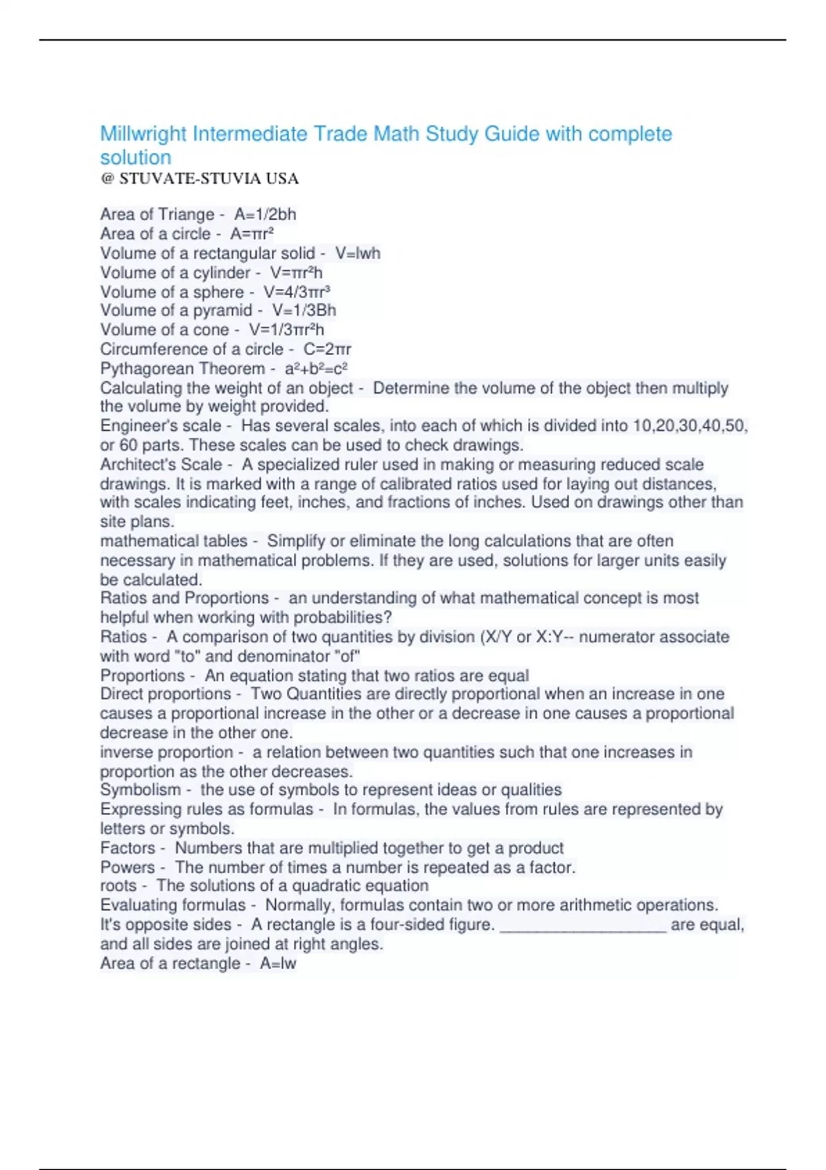 Millwright Intermediate Trade Math Study Guide with complete solution @ STUVATE-STUVIA USA Area of Triange - A=1/2bh Area of a circle - A=πr² Volume of a rectangular solid - V=lwh Volume of a cylinder - V=πr²h Volume of a sphere - V=4/3πr³ Volume of a pyramid - V=1/3Bh Volume of a cone - V=1/3πr²h Circumference of a circle - C=2πr Pythagorean Theorem - a²+b²=c² Calculating the weight of an object - Determine the volume of the object then multiply the volume by weight provided. Engineer's scale - Has several scales, into each of which is divided into 10,20,30,40,50, or 60 parts. These scales can be used to check drawings. Architect's Scale - A specialized ruler used in making or measuring reduced scale drawings. It is marked with a range of calibrated ratios used for laying out distances, with scales indicating feet, inches, and fractions of inches. Used on drawings other than site plans. mathematical tables - Simplify or eliminate the long calculations that are often necessary in mathematical problems. If they are used, solutions for larger units easily be calculated. Ratios and Proportions - a