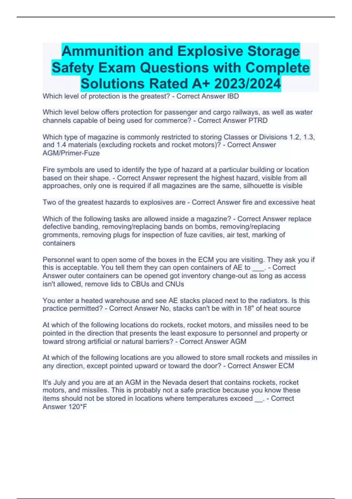 Ammunition and Explosive Storage Safety Exam Questions with Complete Solutions Rated A+ 2023/2024