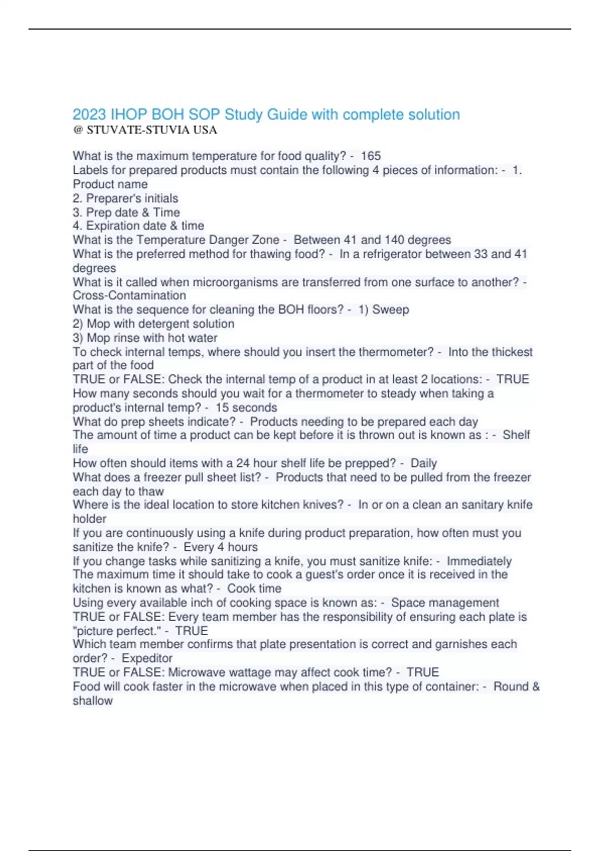 2023 IHOP BOH SOP Study Guide with complete solution @ STUVATE-STUVIA USA What is the maximum temperature for food quality? - 165 Labels for prepared products must contain the following 4 pieces of information: - 1. Product name 2. Preparer's initials 3. Prep date & Time 4. Expiration date & time What is the Temperature Danger Zone - Between 41 and 140 degrees What is the preferred method for thawing food? - In a refrigerator between 33 and 41 degrees What is it called when microorganisms are transferred from one surface to another? - Cross-Contamination What is the sequence for cleaning the BOH floors? - 1) Sweep 2) Mop with detergent solution 3) Mop rinse with hot water To check internal temps, where should you insert the thermometer? - Into the thickest part of the food TRUE or FALSE: Check the internal temp of a product in at least 2 locations: - TRUE How many seconds should you wait for a thermometer to steady when taking a product's internal temp? - 15 seconds What do prep sheets indicate? - Products needing to be prepared each day The amount of time a product can be kept before it is thrown out is known as : - Shelf life How often should items with a 24 hour shelf life be prepped? - Daily What does a freezer pull sheet list? - Products that need to be pulled from the freezer each day to thaw Where is the ideal location to store kitchen knives? - In or on a clean an sanitary knife holder If you are continuously using a knife during product preparation, how often must you sanitize the knife? - Every 4 hours If you change tasks while sanitizing a knife, you must sanitize knife: - Immediately The maximum time it should take to cook a guest's order once it is received in the kitchen is known as what? - Cook time Using every available inch of cooking space is known as: - Space management TRUE or FALSE: Every team member has the responsibility of ensuring each plate is "picture perfect." - TRUE Which team member confirms that plate presentation is correct and garnishes each order? - Expeditor TRUE or FALSE: Microwave wattage may affect cook time? - TRUE Food will cook faster in the microwave when placed in this type of container: - Round & shallow An important step when placing food in the microwave is to: - Cover food to prevent splattering & retain moisture TRUE or FALSE: Upon delivery, frozen foods must be solid to the touch - TRUE Dry goods should be stored at what temperature range? - 50 - 70 degrees What does FIFO stand for? - First In First Out In what order should food that was just delivered be stored/put away? - 1) Refrigerated 2) Frozen 3) Dry Equal parts of diced onions and diced bell peppers are known as what? - Denver Mix The following meat automatically comes with what breakfast dish: 1) 2 Bacon Strips 2) 2 Pork Sausage Links 3) 2 Ham Slices - The Breakfast Sampler What dish comes with 2 triangles of French Toast, 2 eggs, 2 bacon strips, 2 pork sausage links & 2 buttermilk pancakes? - Split Decision breakfast What is used instead of LBA when preparing a dish from the Simple & Fit Menu? - Pam spray Why must the egg batter be agitated before use? - So the solids and liquids can separate after sitting What is the temp of the Wet Grill - 350 degrees What is the proper procedure to heating food before placing it on the steam table? - Re-heat food to 165 degrees and hold that temp for 15 secs, then place it on the steam table Original French Toast is cooked in how much LBA or Salad Oil? - 1/2 oz. When dipping bread into the French Toast Batter, which utensil should you use? - Tongs When re-heating crepes, what do you add to the grill prior to placing each pancake on it? - Nothing When cooking Hash Browns without the hash brown rack, how much LBA do you use for each serving? - 1/2 oz. on the grill. 1/2 oz. on the top of the hash browns Hamburgers & Steaks are always cooked from what state? - Thawed What are Hamburgers & Steaks covered with during cooking? - Nothing A Simple & Fit Omelette is prepared in what? - A 10in Teflon Pan Tilapia Filets are cooked from what state? - Frozen or Thawed, but Thawed is preferred How many pancakes are served with a Rooty Tooty Fresh n Fruity Pancakes? - 4 What is the correct temp for the pancake grill? - 350 degrees How do you determine if a buttermilk pancake is ready to flip? - IF the edges appear dull and bubbles form A full order of buttermilk pancakes is plated on what type of plate? - Service Plate What type of plate do the pancakes come on that come with the 2x2x2? - On the platter with the eggs How many pancakes accompany most 2 egg breakfasts? - 2 What utensil is used to portion buttermilk pancakes? - Belshaw Gun set on #7 When plating Chocolate Chip Pancakes, which side of the pancakes is plated up? - First Side Up (Chocolate Chips Showing) What is placed on the grill before cooking a pancake? - Nothing What products are acceptable to cook on the Dry Grill? - ONLY Pancakes TRUE or FALSE: Most items cooked in the fryer are frozen: - TRUE Why should fryer baskets never be filled more than 1/2 full? - 1) It rapidly reduces oil temp causing improper cooking of product 2) Overfilling could cause fryer to overflow, leading to a fire TRUE or FALSE: Bacon is ALWAYS cooked in the fryer: - FALSE What is the proper temp of fryer oil? - 350 degrees How often should fryer oils be changed? - Once a Day How many mozzarella cheese sticks are served with the Appetizer Sampler? - 3 How many Mozzarella Cheese Sticks are served with the Monster Mozza Sticks menu item? - 5 How many chicken strips are served with the Appetizer Sampler? - 4 What is the portion size of 1 order of french fries? - 6 oz. For how long are the breaded chicken strips cooked for in the Crispy Chicken Strips & Fries? - 5 min How many breaded chicken strips are used in the Crispy Chicken Strips & Fries? - 5 For how long is a Belgian Waffle cooked? - 3.5 minutes How long is the s