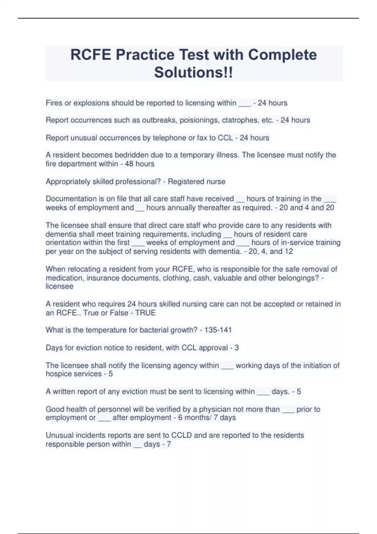Fires or explosions should be reported to licensing within ___ - 24 hours Report occurrences such as outbreaks, poisionings, ctatrophes, etc. - 24 hours Report unusual occurrences by telephone or fax to CCL - 24 hours A resident becomes bedridden due to a temporary illness. The licensee must notify the fire department within - 48 hours Appropriately skilled professional? - Registered nurse Documentation is on file that all care staff have received __ hours of training in the ___ weeks of employment and __ hours annually thereafter as required. - 20 and 4 and 20 The licensee shall ensure that direct care staff who provide care to any residents with dementia shall meet training requirements, including __ hours of resident care orientation within the first ___ weeks of employment and ___ hours of in-service training per year on the subject of serving residents with dementia. - 20, 4, and 12 When relocating a resident from your RCFE, who is responsible for the safe removal of medication, insurance documents, clothing, cash, valuable and other belongings? - licensee A resident who requires 24 hours skilled nursing care can not be accepted or retained in an RCFE.. True or False - TRUE What is the temperature for bacterial growth? - 135-141 Days for eviction notice to resident, with CCL approval - 3 The licensee shall notify the licensing agency within ___ working days of the initiation of hospice services - 5 A written report of any eviction must be sent to licensing within ___ days. - 5 Good health of personnel will be verified by a physician not more than ___ prior to employment or ___ after employment - 6 months/ 7 days Unusual incidents reports are sent to CCLD and are reported to the residents responsible person within __ days - 7 Days employees to have required health screening - 7 Days a signed admission agreement in file - 7 Days of non-perishable food available - 7 Days maxium to submit an incident report - 7 Report death, use of AED, serious injury, etc. - 7 days The department shall be notified within ___ calendar days when the mailing address of the licensee changes - 10 Days to respond to a complaint to licensing - 10 Days to notify applicants change of address to CCL - 10 Days to request a written notice of deficiency review - 10 Days to appeal a penalty assessment - 10 Days to submit documentation of a health related condition to CCL - 10 An applicant may appeal a denied license with written notice of appeal within ___ days of the postmark of the denial notice - 15 Days to nofity CCL/LPA if there is a change in cheif executive officers/organization - 15 Report chief corp officer, corporation, etc. - 15 days A change in administrator requires written notification to the licensing agency within ___ number of working days. - 30 The licensing agency shall be notified within ___ calendar days when a change in licensee occurs - 30 The date for correcting a deficiency shall not be more than __ calendar days following service of the notice of deficiency, unless the evaluator determines that the deficiency cannot be completely corrected in ___ calendar days. - 30,30 Except for change in ownership, the licensee shall notify the licensing agency and all residents receiving services, or their responsible persons, in writing as soon as possible and in all cases that at least ___ days prior to the effective date of that change. - 30 Days to rquest Administrator Certificate after passing test - 30