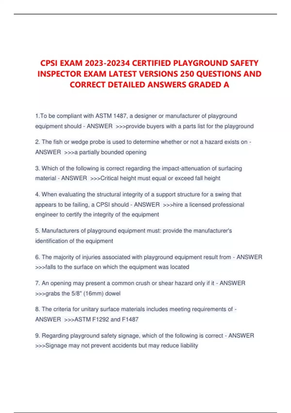 CPSI EXAM CERTIFIED PLAYGROUND SAFETY INSPECTOR EXAM LATEST VERSIONS 250 Q&A