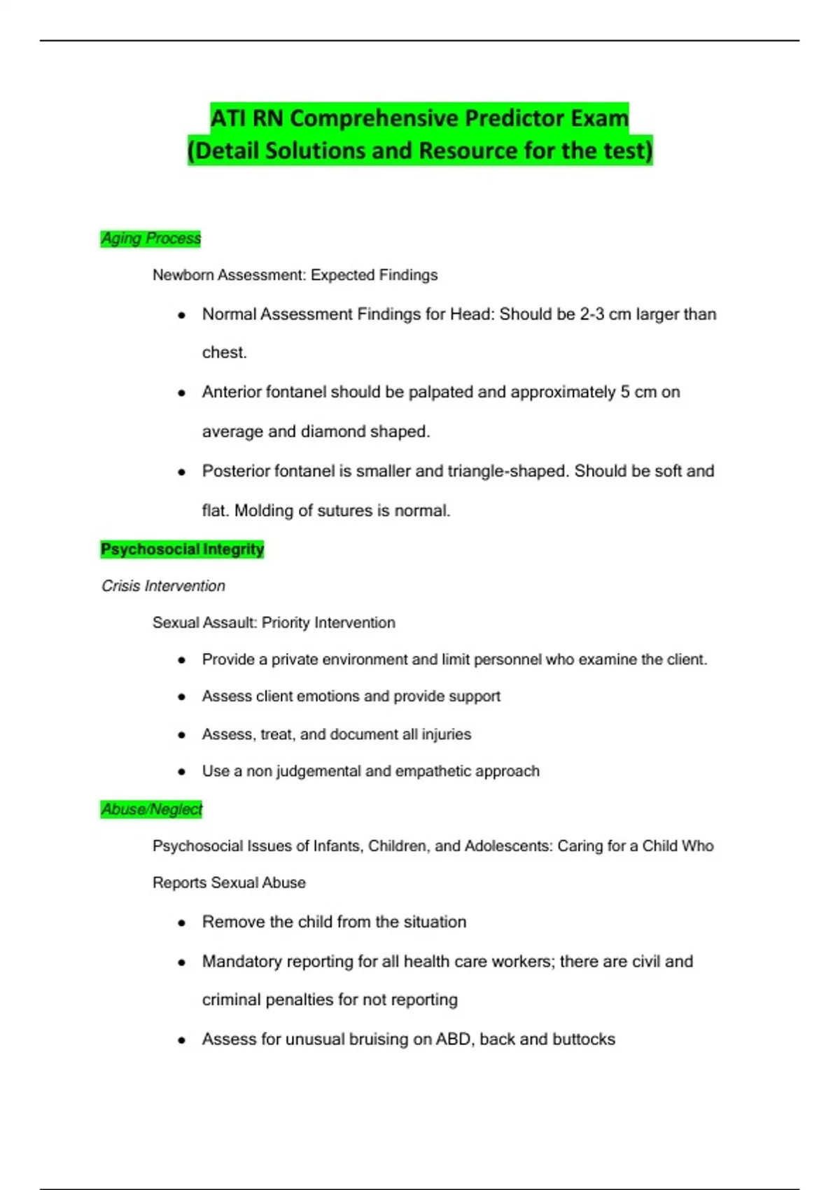 Aging Process Newborn Assessment: Expected Findings ● Normal Assessment Findings for Head: Should be 2-3 cm larger than chest. ● Anterior fontanel should be palpated and approximately 5 cm on average and diamond shaped. ● Posterior fontanel is smaller and triangle-shaped. Should be soft and flat. Molding of sutures is normal. Psychosocial Integrity Crisis Intervention Sexual Assault: Priority Intervention ● Provide a private environment and limit personnel who examine the client. ● Assess client emotions and provide support ● Assess, treat, and document all injuries ● Use a non judgemental and empathetic approach Abuse/Neglect Psychosocial Issues of Infants, Children, and Adolescents: Caring for a Child Who Reports Sexual Abuse ● Remove the child from the situation ● Mandatory reporting for all health care workers; there are civil and criminal penalties for not reporting ● Assess for unusual bruising on ABD, back and buttocks Sensory/Perceptual Alterations Effective Communication: Responding to a Client Who Is Obese and Is Crying Psychotic Disorders: Caring For a Client Who Is Experiencing Delusions ● Ask the client directly about hallucinations. The nurse should not argue or or agree with the client’s view of the situation. ● Do not argue with a client’s delusions, but focus on the client’s feelings and possibly offer reasonable explanations. ● Assess the client for paranoid delusions, which can increase the risk for violence against others. Basic Care and Comfort Elimination Postpartum Physiological Adaptations: Interventions to Promote Voiding ● Assist with frequent urination ● Provide noninvasive measures to promote urination ● Perform bladder scan Nutrition and Oral Hydration Burns: Supporting Nutritional Requirements ● Client with a large burn injury will be in a hypermetabolic state and may exceed 5,000 calories/day ● Increase protein intake to prevent tissue breakdown and promote healing ● Enteral or total parenteral therapy is often necessary Medications for Depressive Disorders: Food and Medication Interaction ● MAOIs- avoid foods containing tyramine (meats, cheeses, alcohol) ● SSRI & SNRI- avoid alcohol ● Tricyclic- do not administer with MAOIs or St. John's Wart Renal Disorders: Teaching a Client Who Has Chronic Kidney Disease ● Strict I&Os ● Monitor electrolytes ● Monitor and treat hypertension as prescribed Stroke: Assisting a Client Who Has Dysphagia ● place client in an upright or high Fowler's position to facilitate swallowing ● stay with client due to risk for aspiration ● refer to speech therapist for evaluation ● make diet alterations, avoid thin liquids and sticky foods