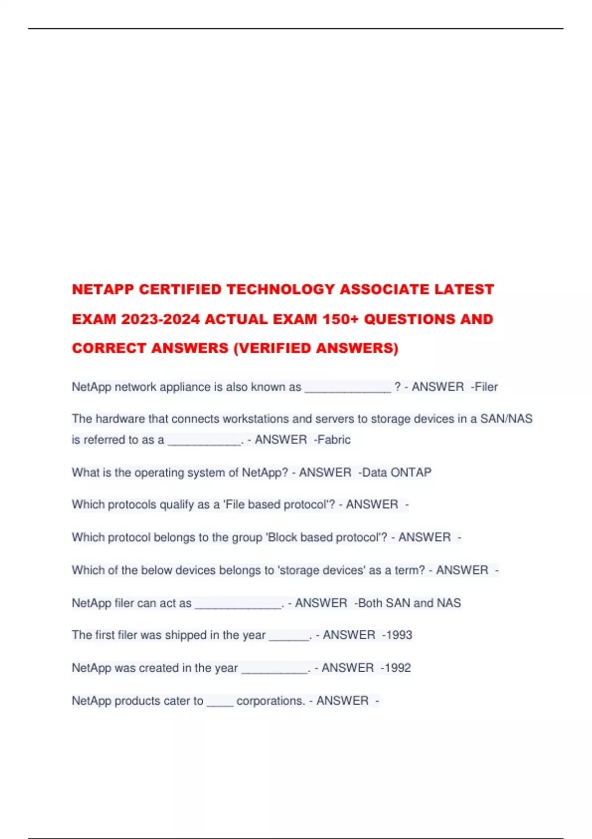 NETAPP CERTIFIED TECHNOLOGY ASSOCIATE LATEST EXAM ACTUAL EXAM 150+ QUESTIONS AND CORRECT ANSWERS (VERIFIED ANSWERS)