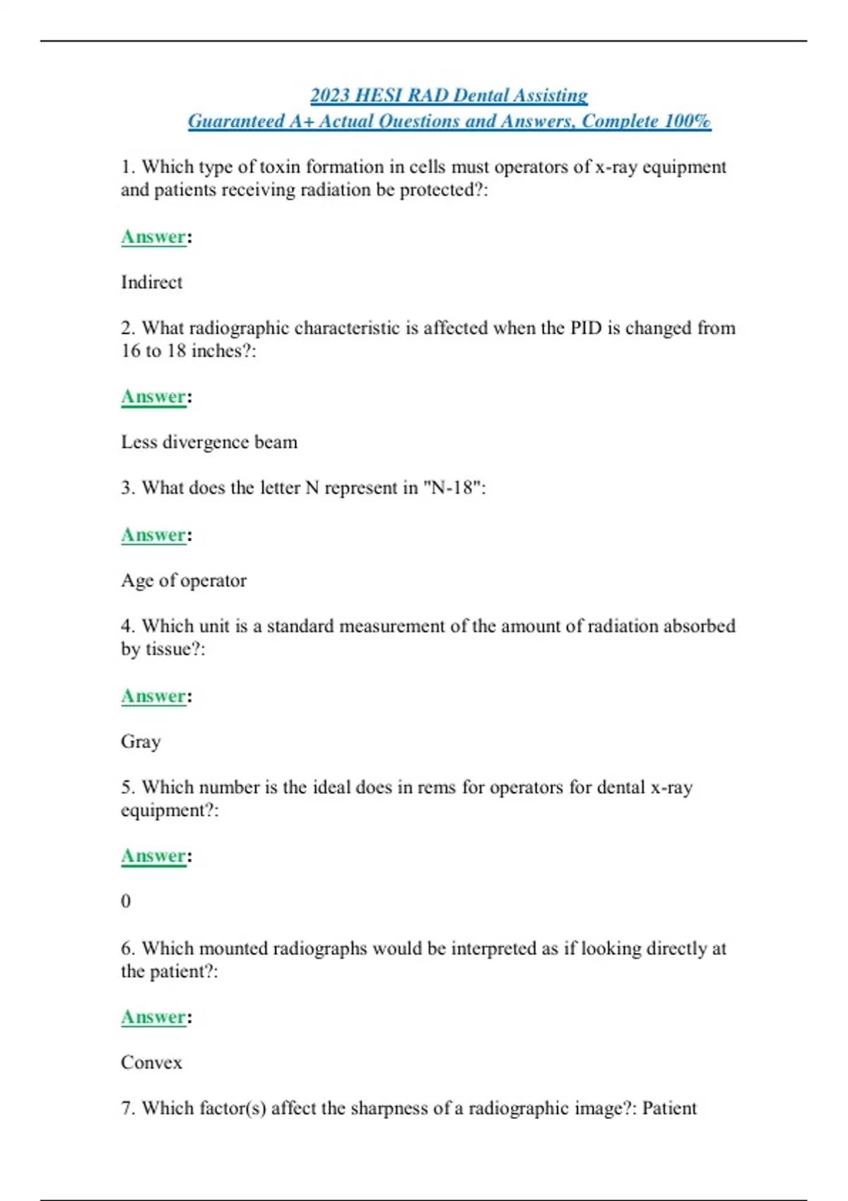 2023 HESI RAD Dental Assisting Guaranteed A+ Actual Questions and Answers, Complete 100% 1. Which type of toxin formation in cells must operators of x-ray equipment and patients receiving radiation be protected?: Answer: Indirect 2. What radiographic characteristic is affected when the PID is changed from 16 to 18 inches?: Answer: Less divergence beam 3. What does the letter N represent in "N-18": Answer: Age of operator 4. Which unit is a standard measurement of the amount of radiation absorbed by tissue?: Answer: Gray 5. Which number is the ideal does in rems for operators for dental x-ray equipment?: Answer: 0 6. Which mounted radiographs would be interpreted as if looking directly at the patient?: Answer: Convex