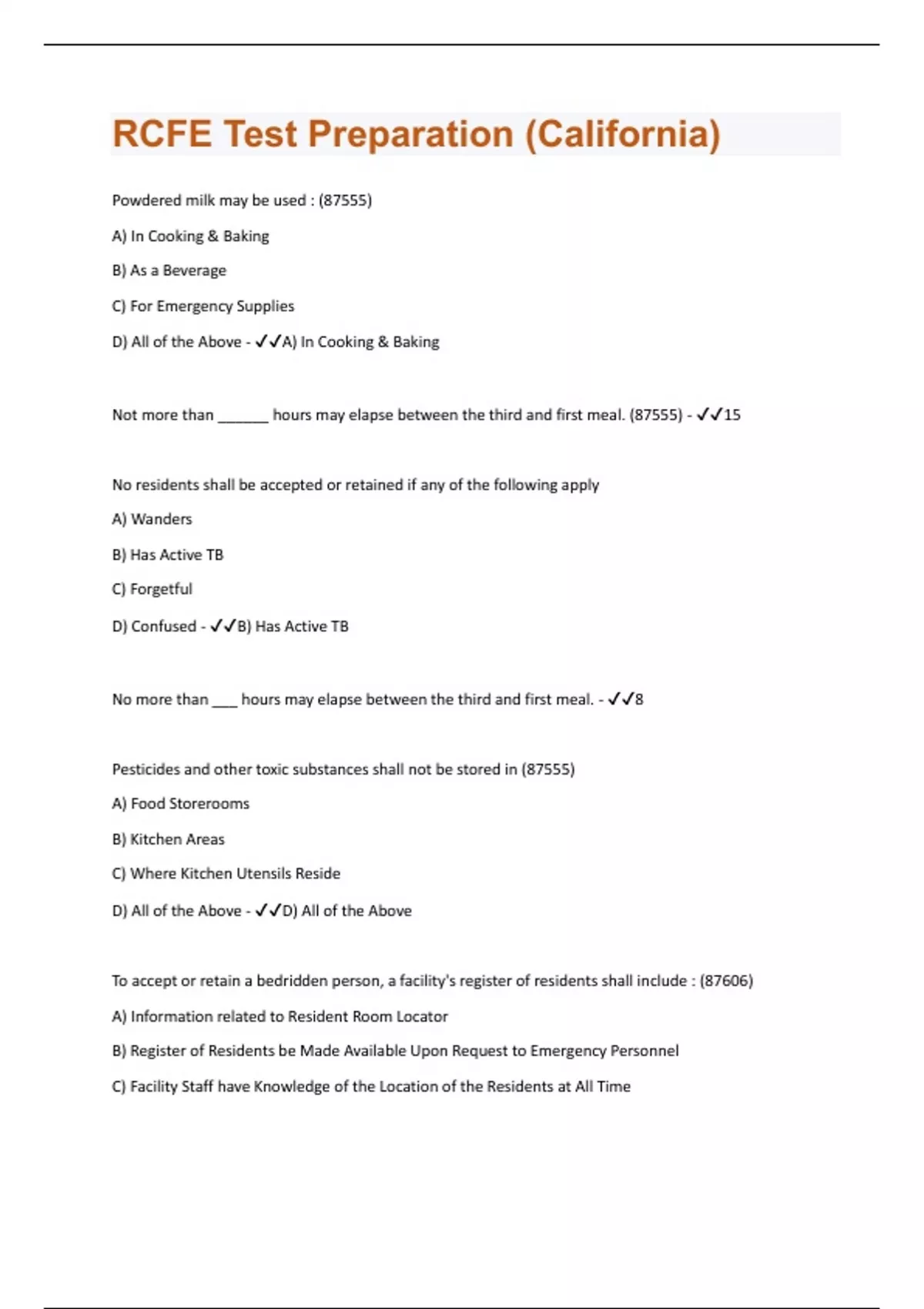 Powdered milk may be used : (87555) A) In Cooking & Baking B) As a Beverage C) For Emergency Supplies D) All of the Above - A) In Cooking & Baking Not more than ______ hours may elapse between the third and first meal. (87555) - 15 No residents shall be accepted or retained if any of the following apply A) Wanders B) Has Active TB C) Forgetful D) Confused - B) Has Active TB No more than ___ hours may elapse between the third and first meal. - 8 Pesticides and other toxic substances shall not be stored in (87555) A) Food Storerooms B) Kitchen Areas C) Where Kitchen Utensils Reside D) All of the Above - D) All of the Above To accept or retain a bedridden person, a facility's register of residents shall include : (87606) A) Information related to Resident Room Locator B) Register of Residents be Made Available Upon Request to Emergency Personnel C) Facility Staff have Knowledge of the Location of the Residents at All TimeD) All of the Above - D) All of the Above Any change in the chief corporate officer shall be reported to the LPA within ______ days. (87211) - 15 days True or False. All medication shall be stored in the container in which it was received unless it is a refill of the same medication (87465) - False The administrator shall have the qualification of (87405) A) Ability to Maintain or Supervise the Maintenance of Financial or other Records B) Good Character and a Continuing Reputation of Personal Integrity C) Be at least 21 years or Age D) All of the Above - D) All of the Above Which document is *not* required when a licensee or applicant requests a transfer of a criminal record exemption fr. 1 state licensed facility to another by providing the following documents to the department : (87355) A) Valid Photo ID issued by another State of the US if the individual is not a California Resident B) Birth Certificate C) Driver's License D) Valid Identification - B) Birth Certificate The Department shall be notified within ____ calendar days when the mailing address of the Licensee changes (87114) - 10