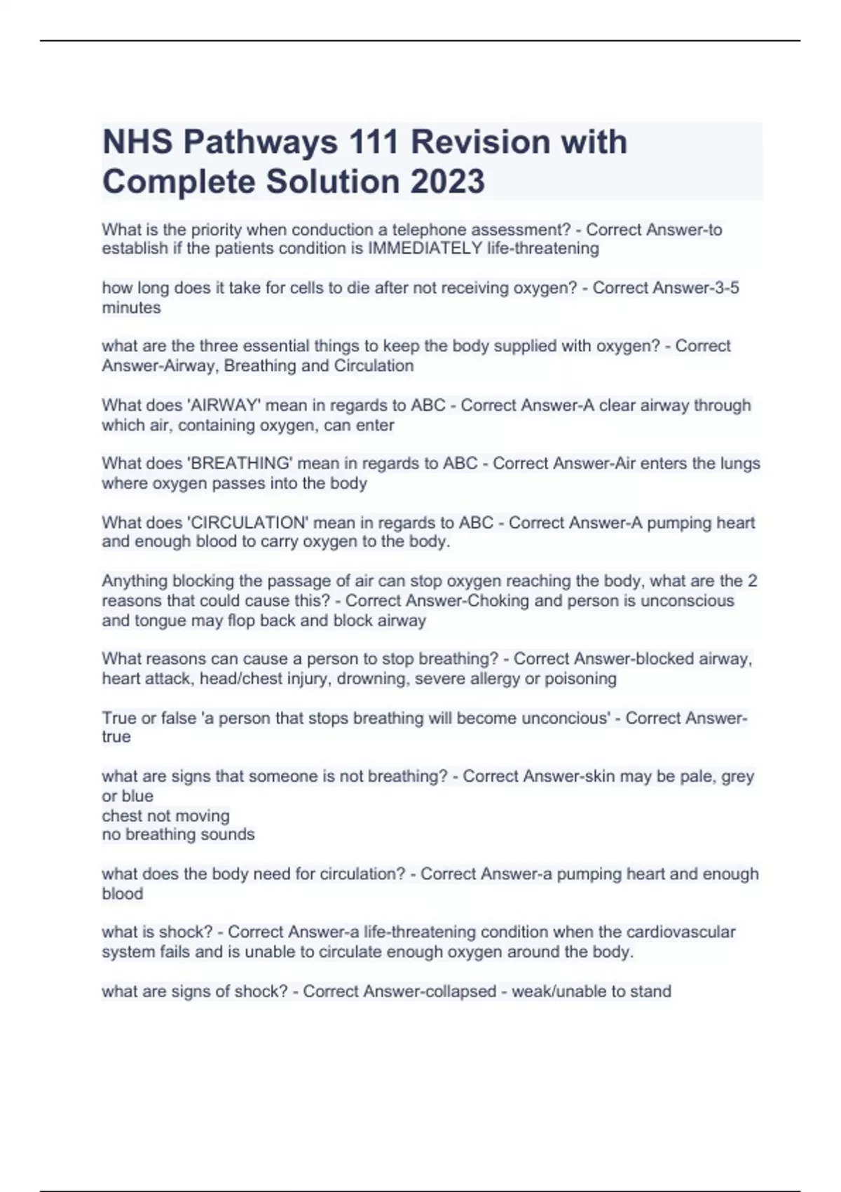 NHS Pathways 111 Revision with Complete Solution 2023