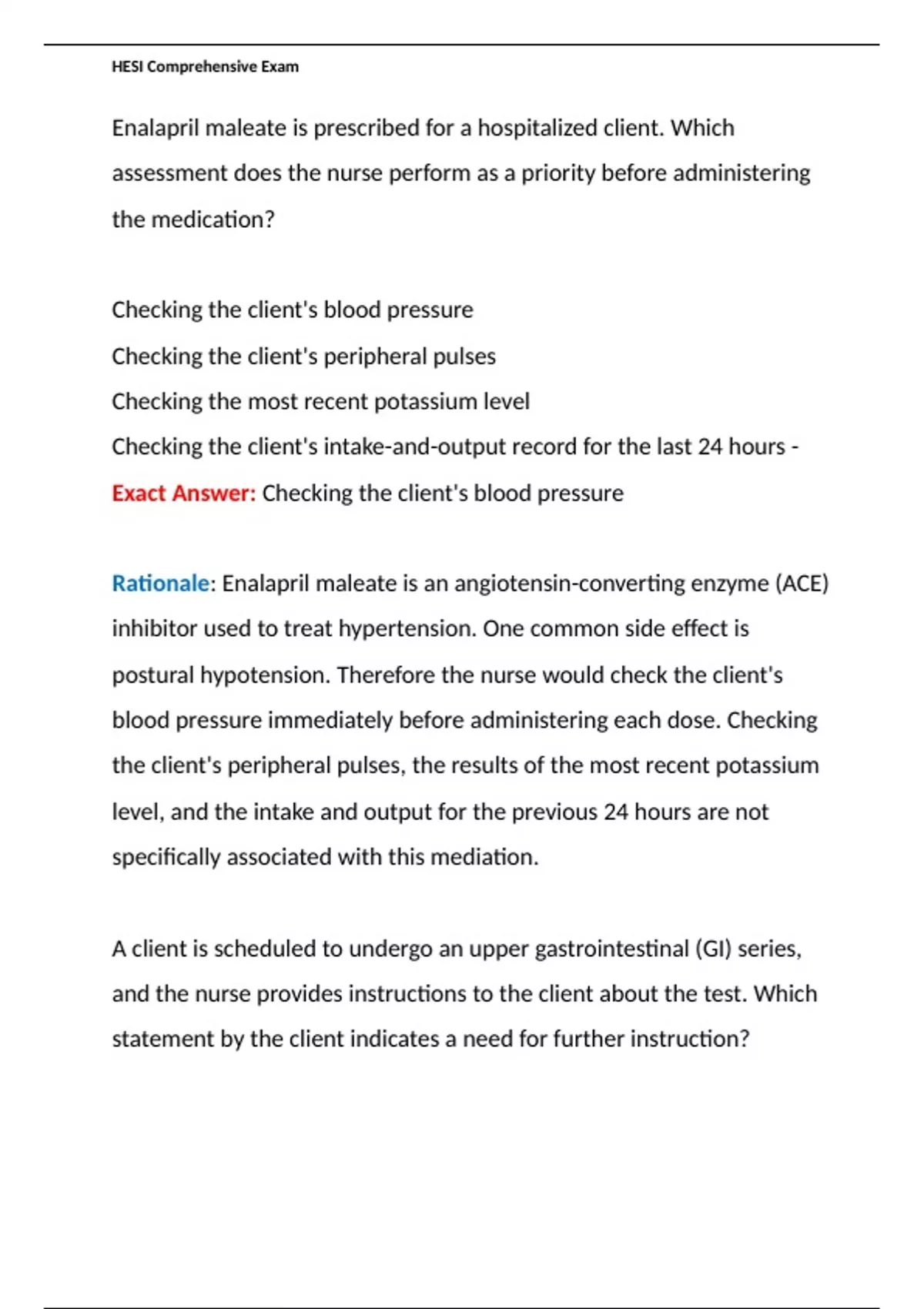 Checking the client's intake-and-output record for the last 24 hours - Exact Answer: Checking the client's blood pressure Rationale: Enalapril maleate is an angiotensin-converting enzyme (ACE) inhibitor used to treat hypertension. One common side effect is postural hypotension. Therefore the nurse would check the client's blood pressure immediately before administering each dose. Checking the client's peripheral pulses, the results of the most recent potassium level, and the intake and output for the previous 24 hours are not specifically associated with this mediation.