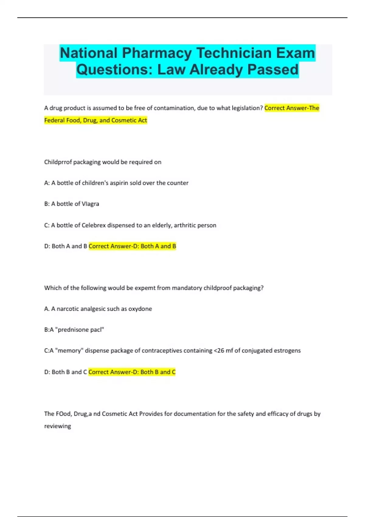 A drug product is assumed to be free of contamination, due to what legislation? Correct Answer-The Federal Food, Drug, and Cosmetic Act Childprrof packaging would be required on A: A bottle of children's aspirin sold over the counter B: A bottle of VIagra C: A bottle of Celebrex dispensed to an elderly, arthritic person D: Both A and B Correct Answer-D: Both A and B Which of the following would be expemt from mandatory childproof packaging? A. A narcotic analgesic such as oxydone B:A "prednisone pacl" C:A "memory" dispense package of contraceptives containing <26 mf of conjugated estrogens D: Both B and C Correct Answer-D: Both B and C The FOod, Drug,a nd Cosmetic Act Provides for documentation for the safety and efficacy of drugs by reviewing