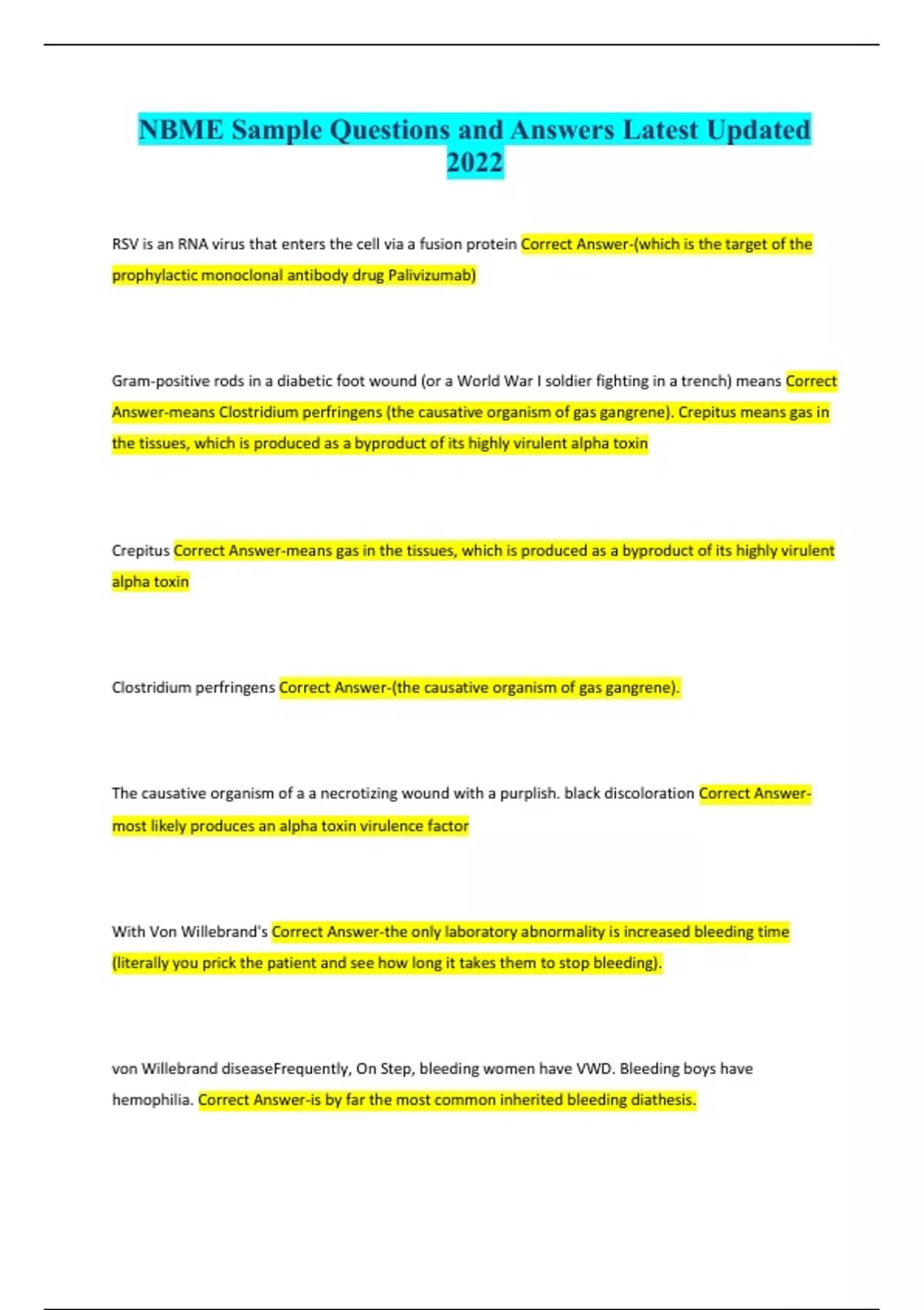 RSV is an RNA virus that enters the cell via a fusion protein Correct Answer-(which is the target of the prophylactic monoclonal antibody drug Palivizumab) Gram-positive rods in a diabetic foot wound (or a World War I soldier fighting in a trench) means Correct Answer-means Clostridium perfringens (the causative organism of gas gangrene). Crepitus means gas in the tissues, which is produced as a byproduct of its highly virulent alpha toxin Crepitus Correct Answer-means gas in the tissues, which is produced as a byproduct of its highly virulent alpha toxin Clostridium perfringens Correct Answer-(the causative organism of gas gangrene). The causative organism of a a necrotizing wound with a purplish. black discoloration Correct Answermost likely produces an alpha toxin virulence factor With Von Willebrand's Correct Answer-the only laboratory abnormality is increased bleeding time (literally you prick the patient and see how long it takes them to stop bleeding). von Willebrand diseaseFrequently, On Step, bleeding women have VWD. Bleeding boys have hemophilia. Correct Answer-is by far the most common inherited bleeding diathesis.
