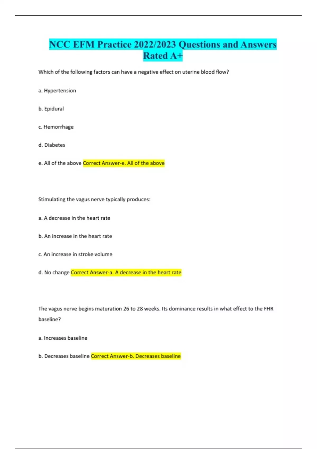 Which of the following factors can have a negative effect on uterine blood flow? a. Hypertension b. Epidural c. Hemorrhage d. Diabetes e. All of the above Correct Answer-e. All of the above Stimulating the vagus nerve typically produces: a. A decrease in the heart rate b. An increase in the heart rate c. An increase in stroke volume d. No change Correct Answer-a. A decrease in the heart rate The vagus nerve begins maturation 26 to 28 weeks. Its dominance results in what effect to the FHR baseline? a. Increases baseline b. Decreases baseline Correct Answer-b. Decreases baseline