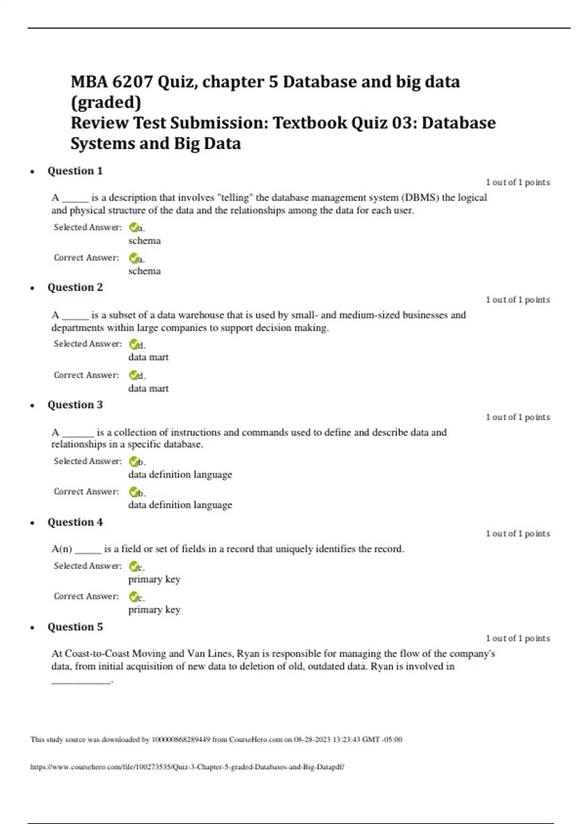 MBA 6207 Quiz, chapter 5 Database and big data (graded)