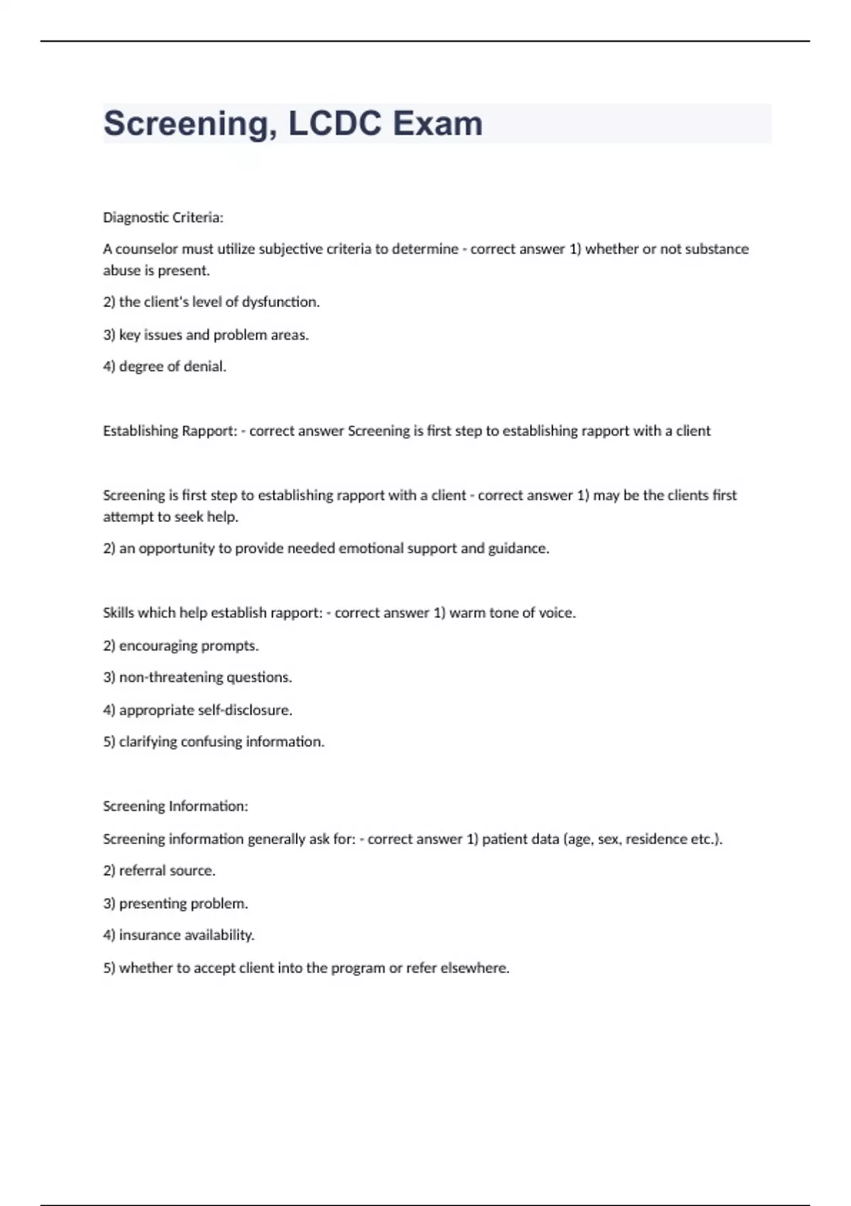 Screening, LCDC Exam correctly answered rated A+ 2023