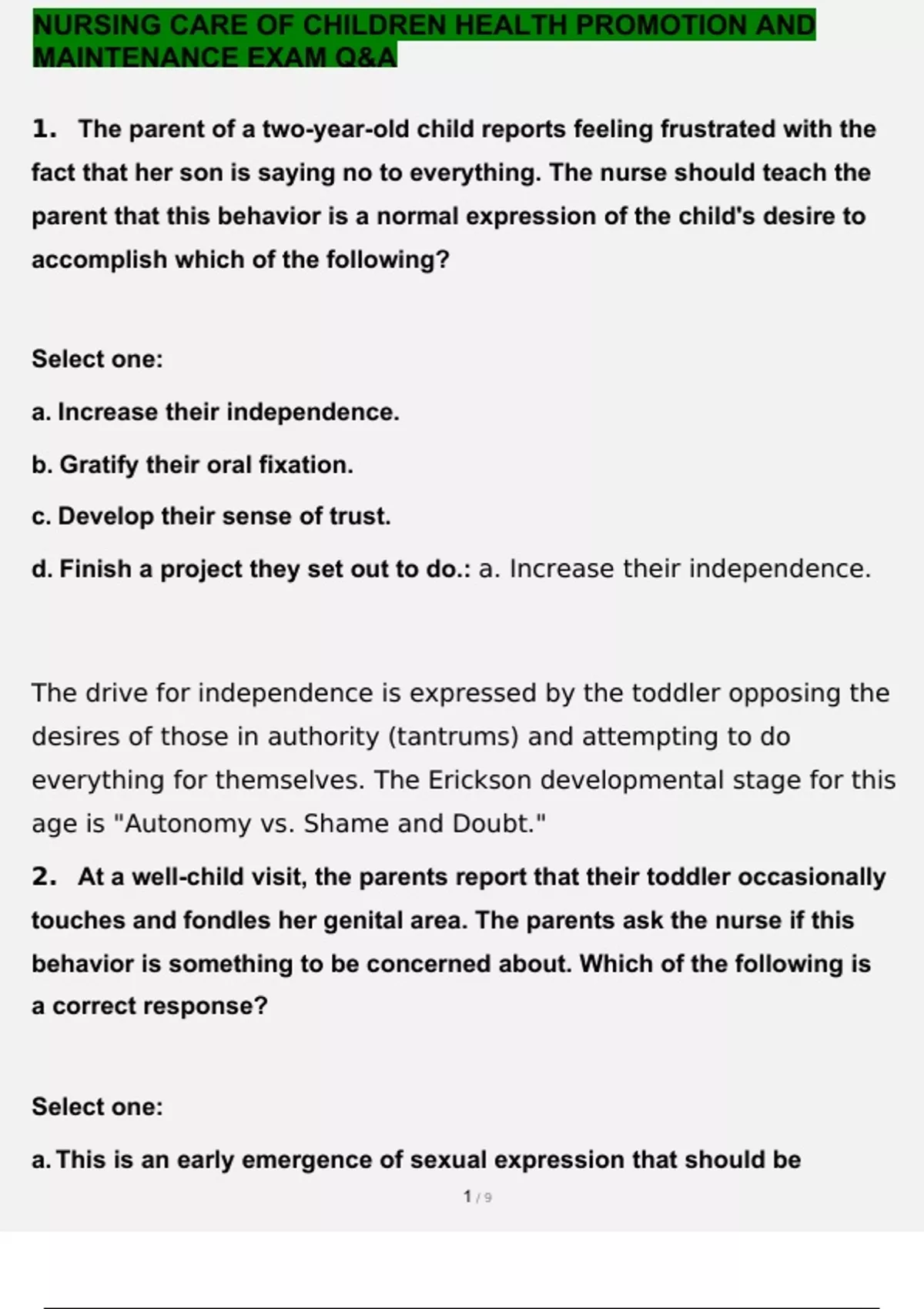 NURSING CARE OF CHILDREN HEALTH PROMOTION AND MAINTENANCE EXAM QUESTIONS AND ANSWERS GRADED A+