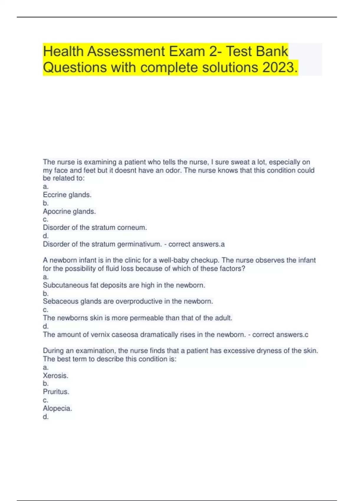 Health Assessment Exam 2- Test Bank Questions with complete solutions 2023. The nurse is examining a patient who tells the nurse, I sure sweat a lot, especially on my face and feet but it doesnt have an odor. The nurse knows that this condition could be related to: a. Eccrine glands. b. Apocrine glands. c. Disorder of the stratum corneum. d. Disorder of the stratum germinativum. - correct answers.a A newborn infant is in the clinic for a well-baby checkup. The nurse observes the infant for the possibility of fluid loss because of which of these factors? a. Subcutaneous fat deposits are high in the newborn. b. Sebaceous glands are overproductive in the newborn. c. The newborns skin is more permeable than that of the adult. d. The amount of vernix caseosa dramatically rises in the newborn. - correct answers.c During an examination, the nurse finds that a patient has excessive dryness of the skin. The best term to describe this condition is: a. Xerosis. b. Pruritus. c. Alopecia. d. Seborrhea. - correct answers.a A patient comes in for a physical examination and complains of freezing to death while waiting for her examination. The nurse notes that her skin is pale and cool and attributes this finding to: a. Venous pooling. b. Peripheral vasodilation. c. Peripheral vasoconstriction. d. Decreased arterial perfusion. - correct answers.c A patient comes to the clinic and states that he has noticed that his skin is redder than normal. The nurse understands that this condition is due to hyperemia and knows that it can be caused by: a. Decreased amounts of bilirubin in the blood b. Excess blood in the underlying blood vessels c. Decreased perfusion to the surrounding tissues d. Excess blood in the dilated superficial capillaries - correct answers.d A newborn infant has Down syndrome. During the skin assessment, the nurse notices a transient mottling in the trunk and extremities in response to the cool temperature in the examination room. The infants mother also notices the mottling and asks what it is. The nurse knows that this mottling is called: a. Caf au lait. b. Carotenemia. c. Acrocyanosis. d. Cutis marmorata. - correct answers.d A 35-year-old pregnant woman comes to the clinic for a monthly appointment. During the assessment, the nurse notices that she has a brown patch of hyperpigmentation on her face. The nurse continues the skin assessment aware that another finding may be: a. Keratoses. b. Xerosis.