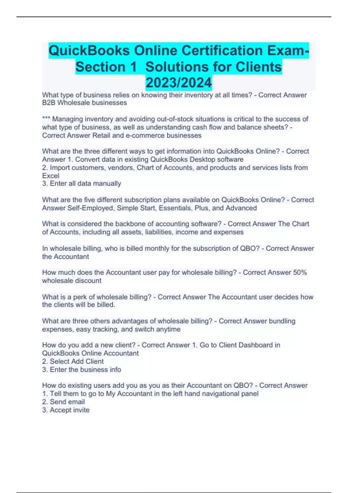 QuickBooks Online Certification Exam- Section 1 Solutions for Clients 2023/2024