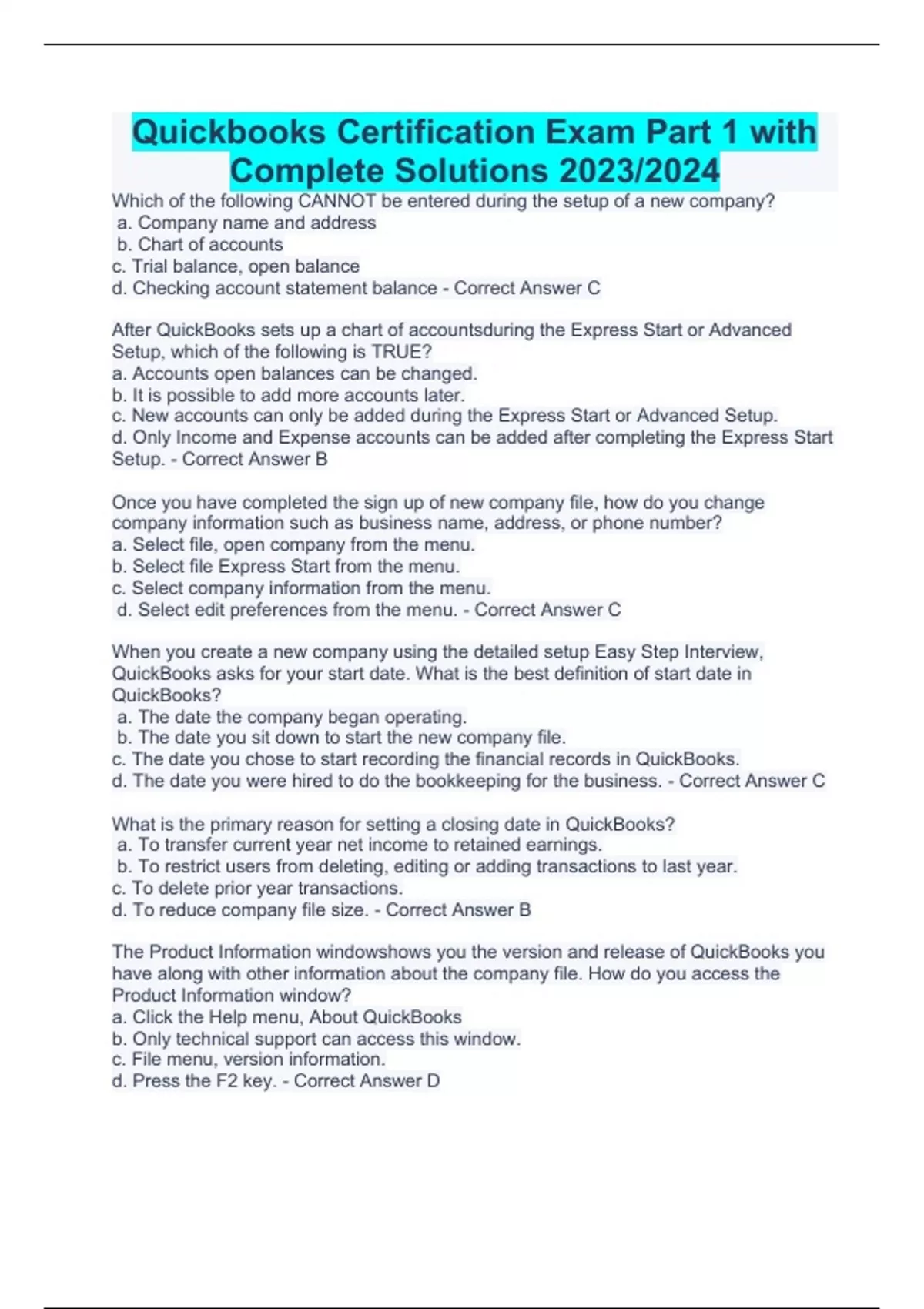 Which of the following CANNOT be entered during the setup of a new company? a. Company name and address b. Chart of accounts c. Trial balance, open balance d. Checking account statement balance - Correct Answer C After QuickBooks sets up a chart of accountsduring the Express Start or Advanced Setup, which of the following is TRUE? a. Accounts open balances can be changed. b. It is possible to add more accounts later. c. New accounts can only be added during the Express Start or Advanced Setup. d. Only Income and Expense accounts can be added after completing the Express Start Setup. - Correct Answer B Once you have completed the sign up of new company file, how do you change company information such as business name, address, or phone number? a. Select file, open company from the menu. b. Select file Express Start from the menu. c. Select company information from the menu. d. Select edit preferences from the menu. - Correct Answer C When you create a new company using the detailed setup Easy Step Interview, QuickBooks asks for your start date. What is the best definition of start date in QuickBooks? a. The date the company began operating. b. The date you sit down to start the new company file. c. The date you chose to start recording the financial records in QuickBooks. d. The date you were hired to do the bookkeeping for the business. - Correct Answer C What is the primary reason for setting a closing date in QuickBooks? a. To transfer current year net income to retained earnings. b. To restrict users from deleting, editing or adding transactions to last year. c. To delete prior year transactions. d. To reduce company file size. - Correct Answer B The Product Information windowshows you the version and release of QuickBooks you have along with other information about the company file. How do you access the Product Information window? a. Click the Help menu, About QuickBooks b. Only technical support can access this window. c. File menu, version information. d. Press the F2 key. - Correct Answer D