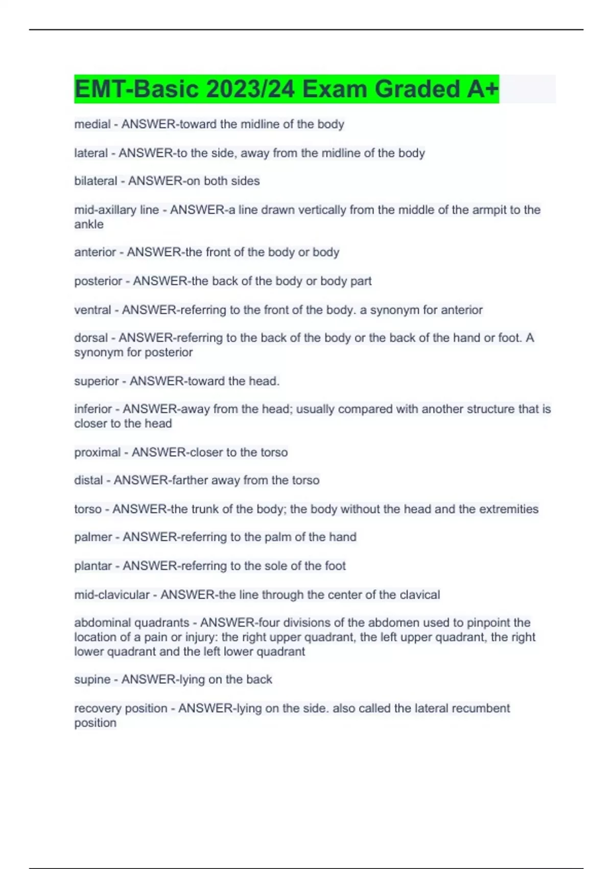medial - ANSWER-toward the midline of the body lateral - ANSWER-to the side, away from the midline of the body bilateral - ANSWER-on both sides mid-axillary line - ANSWER-a line drawn vertically from the middle of the armpit to the ankle anterior - ANSWER-the front of the body or body posterior - ANSWER-the back of the body or body part ventral - ANSWER-referring to the front of the body. a synonym for anterior dorsal - ANSWER-referring to the back of the body or the back of the hand or foot. A synonym for posterior superior - ANSWER-toward the head. inferior - ANSWER-away from the head; usually compared with another structure that is closer to the head proximal - ANSWER-closer to the torso distal - ANSWER-farther away from the torso torso - ANSWER-the trunk of the body; the body without the head and the extremities palmer - ANSWER-referring to the palm of the hand plantar - ANSWER-referring to the sole of the foot mid-clavicular - ANSWER-the line through the center of the clavical abdominal quadrants - ANSWER-four divisions of the abdomen used to pinpoint the location of a pain or injury: the right upper quadrant, the left upper quadrant, the right lower quadrant and the left lower quadrant supine - ANSWER-lying on the back recovery position - ANSWER-lying on the side. also called the lateral recumbent position