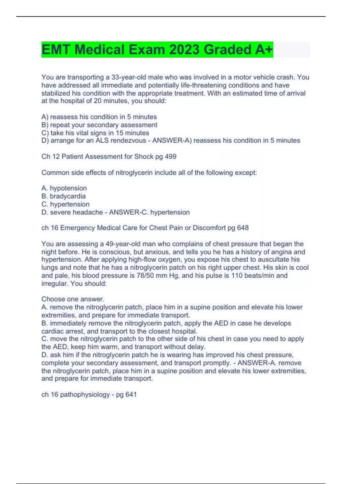 You are transporting a 33-year-old male who was involved in a motor vehicle crash. You have addressed all immediate and potentially life-threatening conditions and have stabilized his condition with the appropriate treatment. With an estimated time of arrival at the hospital of 20 minutes, you should: A) reassess his condition in 5 minutes B) repeat your secondary assessment C) take his vital signs in 15 minutes D) arrange for an ALS rendezvous - ANSWER-A) reassess his condition in 5 minutes Ch 12 Patient Assessment for Shock pg 499 Common side effects of nitroglycerin include all of the following except: A. hypotension B. bradycardia C. hypertension D. severe headache - ANSWER-C. hypertension ch 16 Emergency Medical Care for Chest Pain or Discomfort pg 648 You are assessing a 49-year-old man who complains of chest pressure that began the night before. He is conscious, but anxious, and tells you he has a history of angina and hypertension. After applying high-flow oxygen, you expose his chest to auscultate his lungs and note that he has a nitroglycerin patch on his right upper chest. His skin is cool and pale, his blood pressure is 78/50 mm Hg, and his pulse is 110 beats/min and irregular. You should: Choose one answer. A. remove the nitroglycerin patch, place him in a supine position and elevate his lower extremities, and prepare for immediate transport. B. immediately remove the nitroglycerin patch, apply the AED in case he develops cardiac arrest, and transport to the closest hospital. C. move the nitroglycerin patch to the other side of his chest in case you need to apply the AED, keep him warm, and transport without delay. D. ask him if the nitroglycerin patch he is wearing has improved his chest pressure, complete your secondary assessment, and transport promptly. - ANSWER-A. remove the nitroglycerin patch, place him in a supine position and elevate his lower extremities, and prepare for immediate transport. ch 16 pathophysiology - pg 641