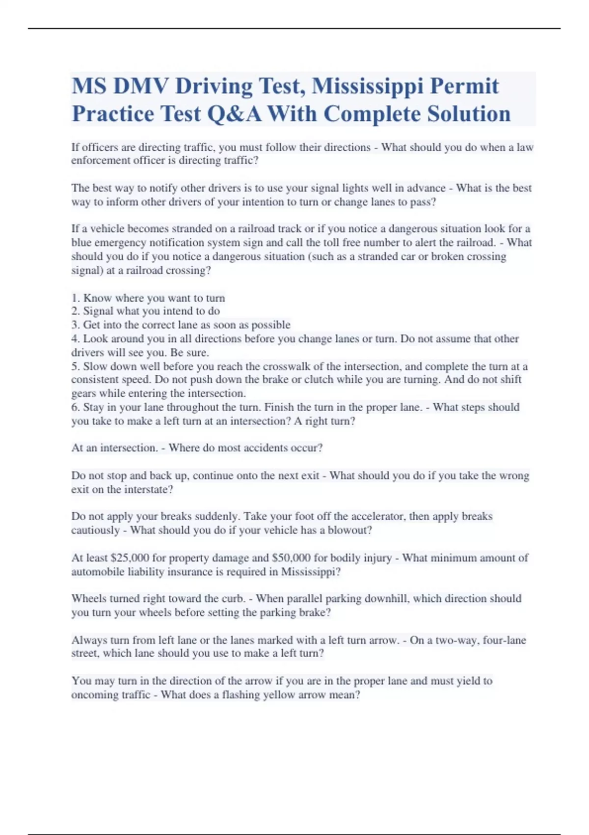MS DMV Driving Test, Mississippi Permit Practice Test Q&A With Complete Solution If officers are directing traffic, you must follow their directions - What should you do when a law enforcement officer is directing traffic? The best way to notify other drivers is to use your signal lights well in advance - What is the best way to inform other drivers of your intention to turn or change lanes to pass? If a vehicle becomes stranded on a railroad track or if you notice a dangerous situation look for a blue emergency notification system sign and call the toll free number to alert the railroad. - What should you do if you notice a dangerous situation (such as a stranded car or broken crossing signal) at a railroad crossing? 1. Know where you want to turn 2. Signal what you intend to do 3. Get into the correct lane as soon as possible 4. Look around you in all directions before you change lanes or turn. Do not assume that other drivers will see you. Be sure. 5. Slow down well before you reach the crosswalk of the intersection, and complete the turn at a consistent speed. Do not push down the brake or clutch while you are turning. And do not shift gears while entering the intersection. 6. Stay in your lane throughout the turn. Finish the turn in the proper lane. - What steps should you take to make a left turn at an intersection? A right turn? At an intersection. - Where do most accidents occur? Do not stop and back up, continue onto the next exit - What should you do if you take the wrong exit on the interstate? Do not apply your breaks suddenly. Take your foot off the accelerator, then apply breaks cautiously - What should you do if your vehicle has a blowout? At least $25,000 for property damage and $50,000 for bodily injury - What minimum amount of automobile liability insurance is required in Mississippi? Wheels turned right toward the curb. - When parallel parking downhill, which direction should you turn your wheels before setting the parking brake? Always turn from left lane or the lanes marked with a left turn arrow. - On a two-way, four-lane street, which lane should you use to make a left turn? You may turn in the direction of the arrow if you are in the proper lane and must yield to oncoming traffic - What does a flashing yellow arrow mean? The first opening minutes of rain or drizzle - When are paved roads likely to be their slickest? Merge left when safe to do so, so vehicles may enter the right lane safely - If you are traveling in the right lane of an interstate highway, what adjustments should you make when other vehicles are entering the highway? Driving so fast that you cannot stop within the distance you can see. - What does "over-driving" your headlights mean? Take a break every 100 miles. Do not follow the same vehicle of group of vehicles for long distances. You may become too relaxed and lose your concentration. To avoid going to sleep at the wheel, do not stare. Keep your eyes moving. Keep the interior of your car as cool as possible. - What strategies should drivers follow when traveling long distances? Turn off your high beams so that you do not blind the other drivers. - When you overtake another vehicle at night, why should you use your low beams? Pull over to the extreme right shoulder of the road until the emergency vehicle has passed. If the vehicle is parked on the shoulder, merge into the next lane possible. - What should you do if you are being overtaken by an emergency vehicle (fire truck, police car, ambulance) flashing its emergency lights? To let the driver behind you know what you are doing, signal at least 100 ft from the intersection. - Why should you use your turn signals well in advance of a turn? At least one-quarter mile from your exit - When exiting from the interstate, when should you be in the correct lane? Wait until the way is clear and look back while backing up - What should you do before backing out of a parking space? Get out of vehicle - What should you do if your vehicle becomes stranded on a railroad track? Following too closely is extremely dangerous because of how fast you are going - Why are rear-end collisions so common on interstate highways? Before you enter an intersection - At an intersection, when must you determine right-of-way? During ideal conditions - When may you drive at the posted speed limits in Mississippi? You become too distracted and preoccupied to handle your vehicle safely - Why shouldn't you drive when you are ill, angry, or depressed? Tires should be within 12 inches of the curb - What is the legal maximum distance at which you may park your car parallel to the curb?