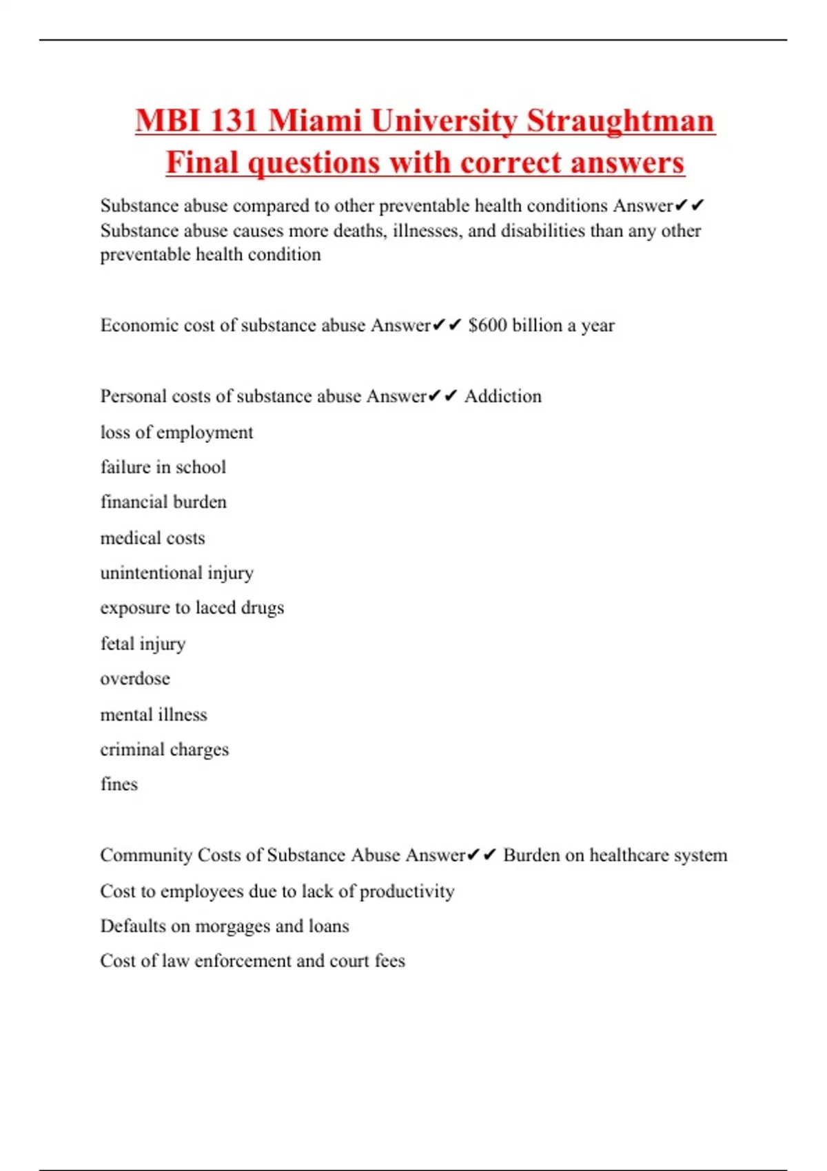 Substance abuse compared to other preventable health conditions Answer Substance abuse causes more deaths, illnesses, and disabilities than any other preventable health condition Economic cost of substance abuse Answer $600 billion a year Personal costs of substance abuse Answer Addiction loss of employment failure in school financial burden medical costs unintentional injury exposure to laced drugs fetal injury overdose mental illness criminal charges fines Community Costs of Substance Abuse Answer Burden on healthcare system Cost to employees due to lack of productivity Defaults on morgages and loans Cost of law enforcement and court fee