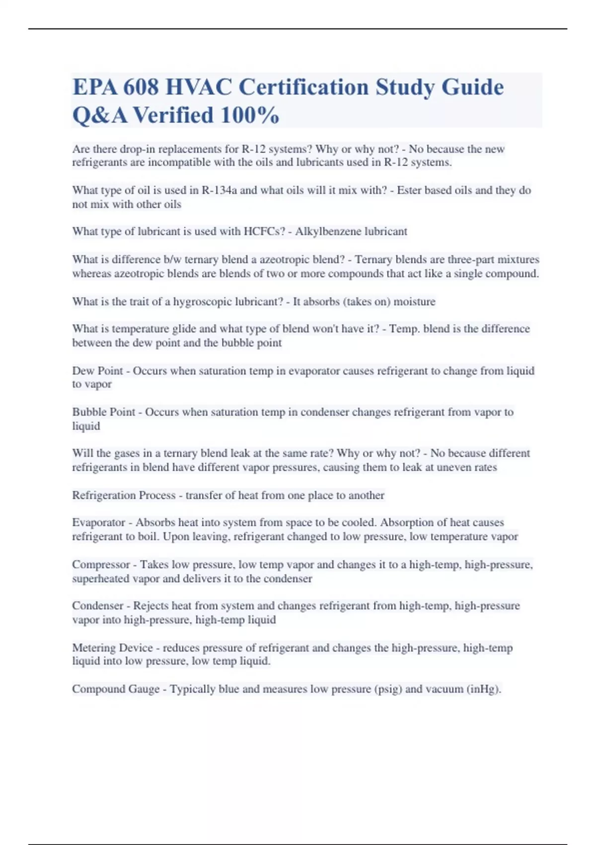 EPA 608 HVAC Certification Study Guide Q&A Verified 100% Are there drop-in replacements for R-12 systems? Why or why not? - No because the new refrigerants are incompatible with the oils and lubricants used in R-12 systems. What type of oil is used in R-134a and what oils will it mix with? - Ester based oils and they do not mix with other oils What type of lubricant is used with HCFCs? - Alkylbenzene lubricant What is difference b/w ternary blend a azeotropic blend? - Ternary blends are three-part mixtures whereas azeotropic blends are blends of two or more compounds that act like a single compound. What is the trait of a hygroscopic lubricant? - It absorbs (takes on) moisture What is temperature glide and what type of blend won't have it? - Temp. blend is the difference between the dew point and the bubble point Dew Point - Occurs when saturation temp in evaporator causes refrigerant to change from liquid to vapor Bubble Point - Occurs when saturation temp in condenser changes refrigerant from vapor to liquid Will the gases in a ternary blend leak at the same rate? Why or why not? - No because different refrigerants in blend have different vapor pressures, causing them to leak at uneven rates Refrigeration Process - transfer of heat from one place to another Evaporator - Absorbs heat into system from space to be cooled. Absorption of heat causes refrigerant to boil. Upon leaving, refrigerant changed to low pressure, low temperature vapor Compressor - Takes low pressure, low temp vapor and changes it to a high-temp, high-pressure, superheated vapor and delivers it to the condenser Condenser - Rejects heat from system and changes refrigerant from high-temp, high-pressure vapor into high-pressure, high-temp liquid Metering Device - reduces pressure of refrigerant and changes the high-pressure, high-temp liquid into low pressure, low temp liquid. Compound Gauge - Typically blue and measures low pressure (psig) and vacuum (inHg). High Pressure Gauge - Red and measures high side (discharge) pressure. 0 to 500 psi What does a compressor compress? - Vapor Why will refrigerant migrate to the crankcase in a compressor? - Because of the vapor pressure difference between refrigerant and oil What color is the high pressure gauge? - Red What color is the low pressure gauge? - Blue What needs to happen if oil has been contaminated by burnout? - Triple evacuate system, install permanent filter-drier, conduct deep vacuum before recharging What are three Rs of refrigeration? - Recover, recycle, reclaim Recover - to remove any refrigerant in any condition from system and store in external container without necessarily testing or processing in any way Recycle - To clean refrigerant for immediate reuse by separating oil from refrigerant and removing moisture and acidity from refrigerant by use of products like filter driers Reclaim - To process refrigerant to level of new product specifications as determines by chemical analysis What standards must refrigerant recovery equipment meet and what components must all Type I and Type II refrigerant systems have? - EPA-approved equipment testing organization. Service aperture or process stub System-Dependent Devices - Capture refrigerant with assistance of compressor and/or pressure of refrigerant in appliances from which refrigerant is being recovered Self-contained Devices - Have independent means to draw refrigerant out of appliances What is nitrogen and a filter-drier used for after recovery? - Use nitrogen to flush debris out of system after recovering refrigerant. Filter-drier should be installed to trap any debris that may cause damage to new compressor What must be done before starting an evacuation? - Recover all refrigerant and attain the mandated vacuum level ASHRAE Standard 15-1994 - Requires refrigerant sensor that will sound alarm and automatically start ventilation system in occupied equipment rooms where refrigerant from leak will concentrate How often should refillable cylinders be hydrostatically tested? - 5 years What are the three ways you can control fill level of refillable cylinder? - Mechanical floats, electronic floats, or weight