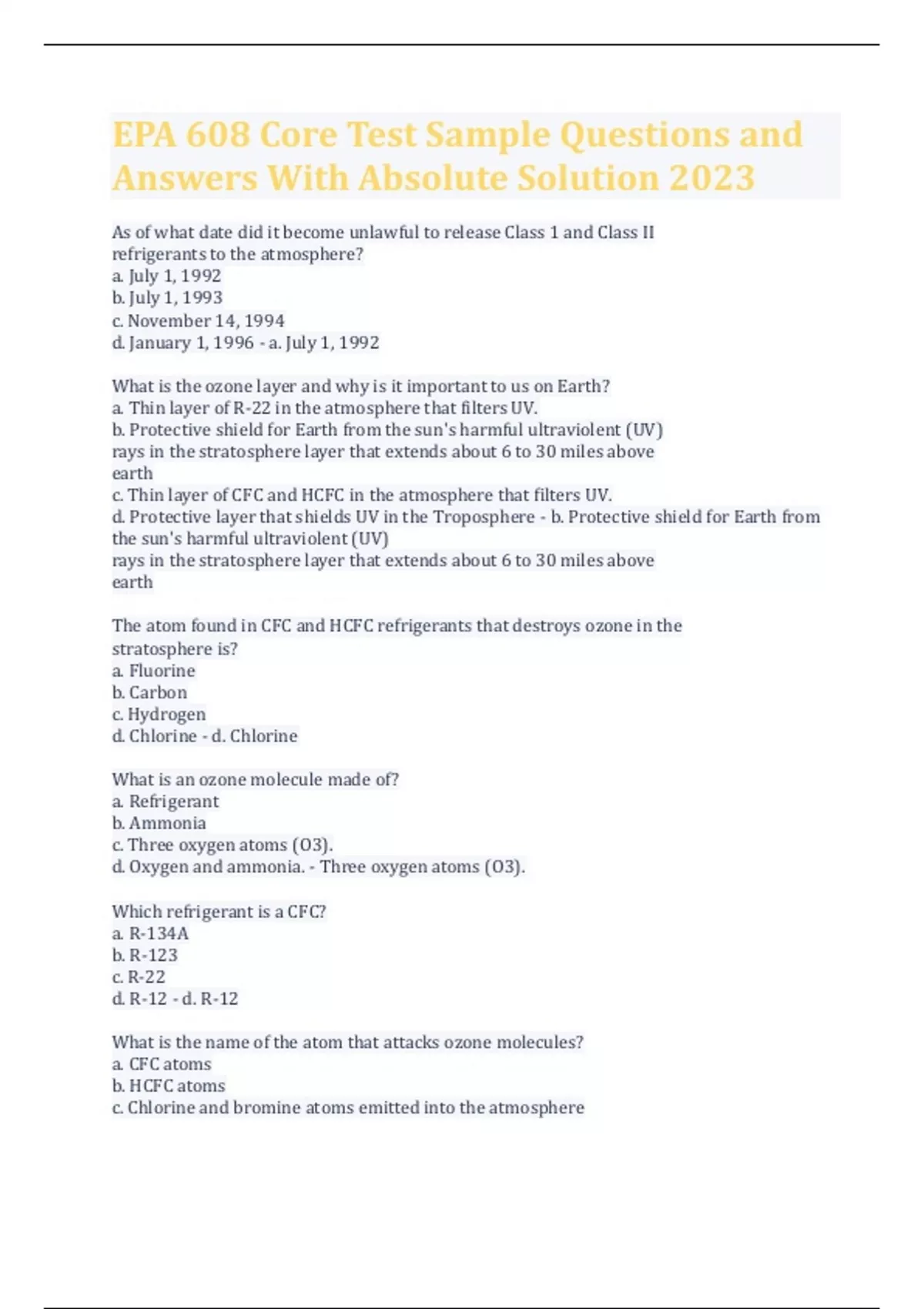 EPA 608 Core Test Sample Questions and Answers With Absolute Solution 2023