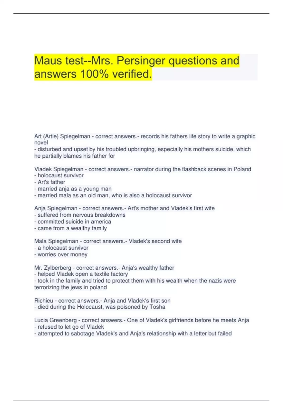 Maus test--Mrs. Persinger questions and answers 100% verified. Art (Artie) Spiegelman - correct answers.- records his fathers life story to write a graphic novel - disturbed and upset by his troubled upbringing, especially his mothers suicide, which he partially blames his father for Vladek Spiegelman - correct answers.- narrator during the flashback scenes in Poland - holocaust survivor - Art's father - married anja as a young man - married mala as an old man, who is also a holocaust survivor Anja Spiegelman - correct answers.- Art's mother and Vladek's first wife - suffered from nervous breakdowns - committed suicide in america - came from a wealthy family Mala Spiegelman - correct answers.- Vladek's second wife - a holocaust survivor - worries over money Mr. Zylberberg - correct answers.- Anja's wealthy father - helped Vladek open a textile factory - took in the family and tried to protect them with his wealth when the nazis were terrorizing the jews in poland Richieu - correct answers.- Anja and Vladek's first son - died during the Holocaust, was poisoned by Tosha Lucia Greenberg - correct answers.- One of Vladek's girlfriends before he meets Anja - refused to let go of Vladek - attempted to sabotage Vladek's and Anja's relationship with a letter but failed Miss Stefanska - correct answers.- Anja's seamstress - Neighbor who hid a package for Anja during a Nazi search - remained silent about it even after being arrested Tosha - correct answers.- Anja's sister - went to a safer community with children and richieu - poisoned the children and herself when the Nazis began to clear their neighborhood Haskel - correct answers.- Vladek's cousin - Jewish chief of police - agreed too help Vladek and Anja but could not help Anja's parents Miloch - correct answers.- Haskel's brother - Helped hide Vladek in the shoe shop Mrs. Motonowa - correct answers.- Polish women who pitied jews and hid them in her home - hid Vladek and Anja in her basement while her husband was home - sells food on the black market Orbach - correct answers.- family friend who pretended Vladek was his cousin so he could be released into his custody - updated Vladek on news of nazi activity Mr. Ilzecki - correct answers.- helped Vladek use the black market to care for his family Mordecai - correct answers.- Vladek's cousin who worked of the Nazis - helped prevent the family from being shipped to prison camps Uncle Persis - correct answers.- member of a jewish council in a town governed by Nazis - offered to take and protect Vladek's children in his safer community Francoise - correct answers.- Art's wife - A french woman who is Art's wife, converted to Judaism to please Vladek Lukowski - correct answers.- Janitor in Anja's fathers house Herman - correct answers.- Anja's brother Fela - correct answers.- Vladek's sister - Vladek's sister who was sent to the opposite side of the stadium with her four kids because she didn't have a husband Mrs. Kawka - correct answers.- houses Vladek and Anja -Owner of a small farm; Allows Vladek and Anja to hide in the barn Vladek felt unsettled when Anja insisted on seeing his apartment - correct answers.False Lucia mocks Anja's appearance - correct answers.True Anja took pills because she was "so skinny and nervous" - correct answers.True Anja got upset after learning Vladek dated her and Lucia Greenberg simultaneously - correct answers.False Vladek wants Art to exclude Anja and Lucia from his story because they have nothing to do with the Holocaust - correct answers.True People told __________ that he looked like Rudolph Valentino, who was known as "The _____________." - correct answers.- Vladek - Sheik Vladek dated ___________ ____________ for three or four years before she suggested they get engaged. - correct answers.Lucia Greenberg The Zylberbergs owned a ______________ factory, one of the biggest in _____________. - correct answers.- hosiery - Poland Anja's father gave Vladek a beautiful ______________ ______________ as a wedding gift. - correct answers.Gold watch Vladek gets upset with ______________ when she puts Art's jacket on a ______________ ______________. - correct answers.- Mala - wire hanger As an older man, Vladek has one eye with a cataract and one glass eye - correct answers.True Anja helped translate Communist papers for a friend from Warsaw - correct answers.True Miss Stefanska, Anja's neighbor, told the police about Anja's illegal activities - correct answers.False Richieu was born premature, and the doctors had to break his arm at birth - correct answers.False