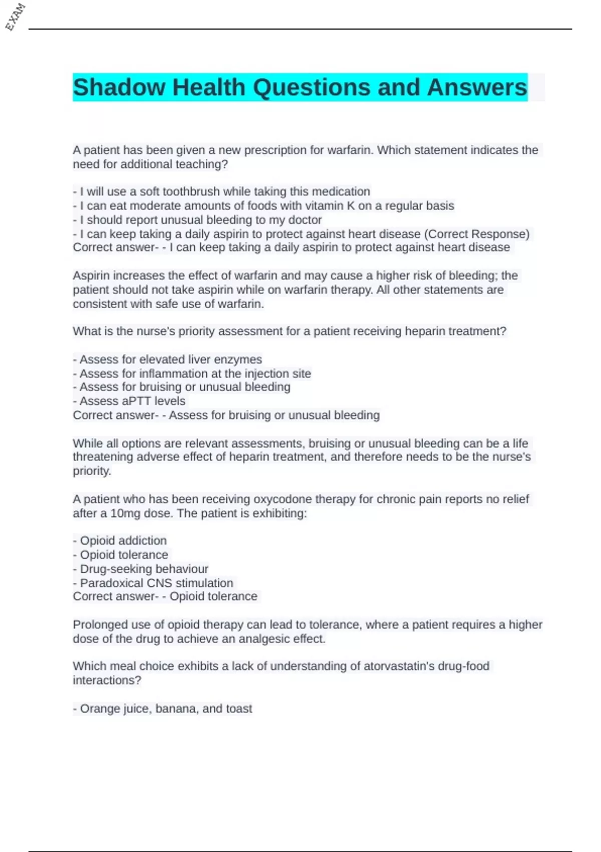A patient has been given a new prescription for warfarin. Which statement indicates the need for additional teaching? - I will use a soft toothbrush while taking this medication - I can eat moderate amounts of foods with vitamin K on a regular basis - I should report unusual bleeding to my doctor - I can keep taking a daily aspirin to protect against heart disease (Correct Response) Correct answer- - I can keep taking a daily aspirin to protect against heart disease Aspirin increases the effect of warfarin and may cause a higher risk of bleeding; the patient should not take aspirin while on warfarin therapy. All other statements are consistent with safe use of warfarin. What is the nurse's priority assessment for a patient receiving heparin treatment? - Assess for elevated liver enzymes - Assess for inflammation at the injection site - Assess for bruising or unusual bleeding - Assess aPTT levels Correct answer- - Assess for bruising or unusual bleeding