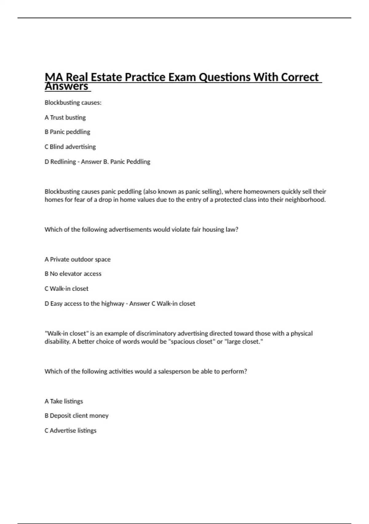 MASSACHUSETTS PORTION OF REAL ESTATE EXAM TEST SOLVED 100%