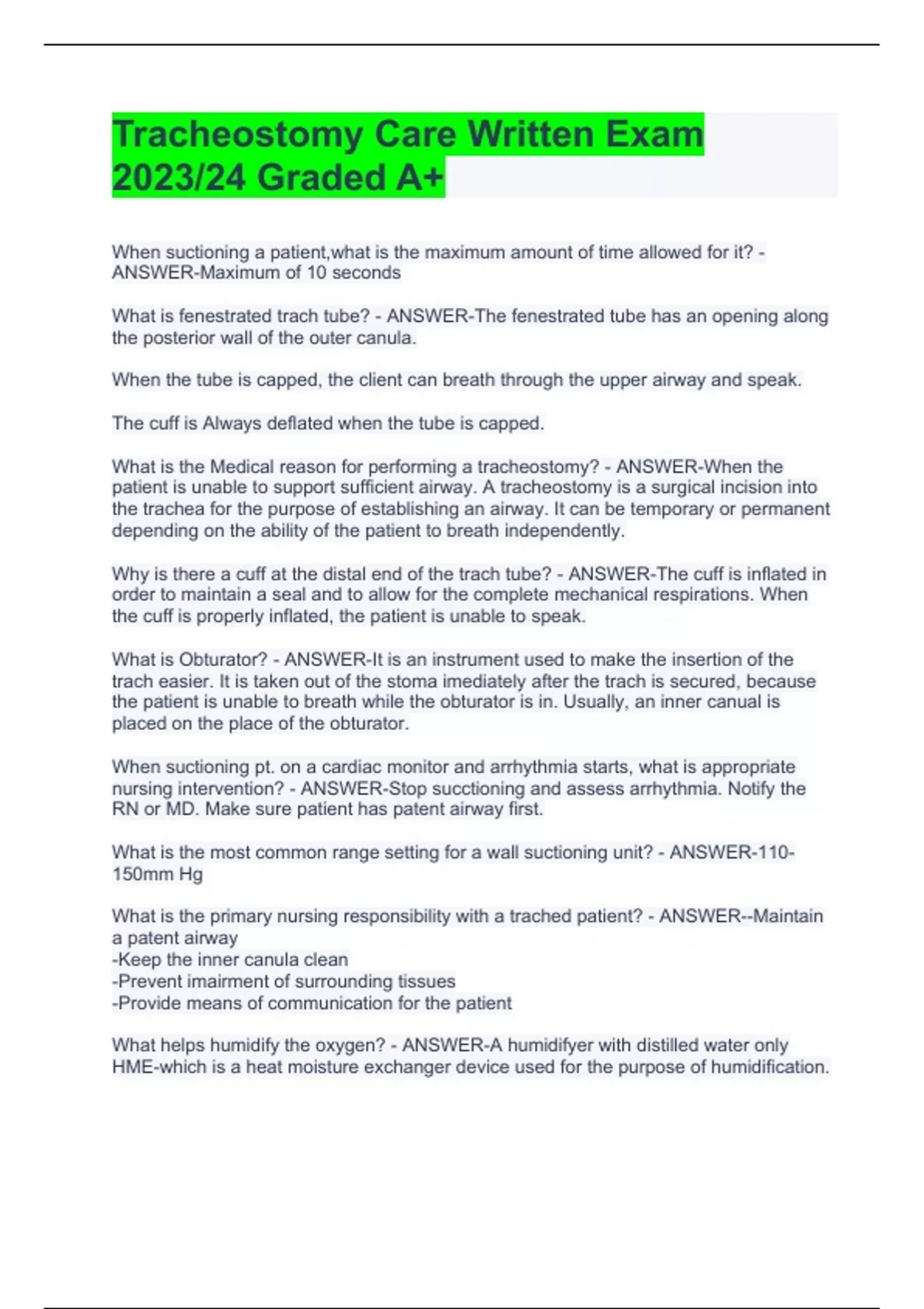 Tracheostomy Care Written Exam 2023/24 Graded A+
