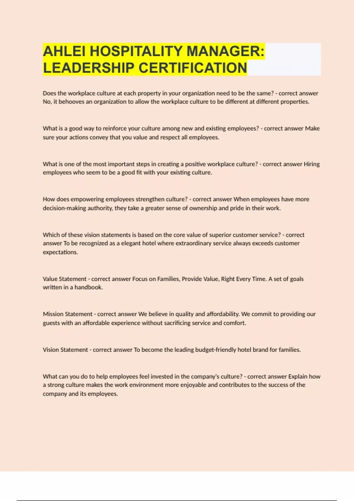 AHLEI HOSPITALITY MANAGER LEADERSHIP CERTIFICATION|2023/24 UPDATE|GRADED A+