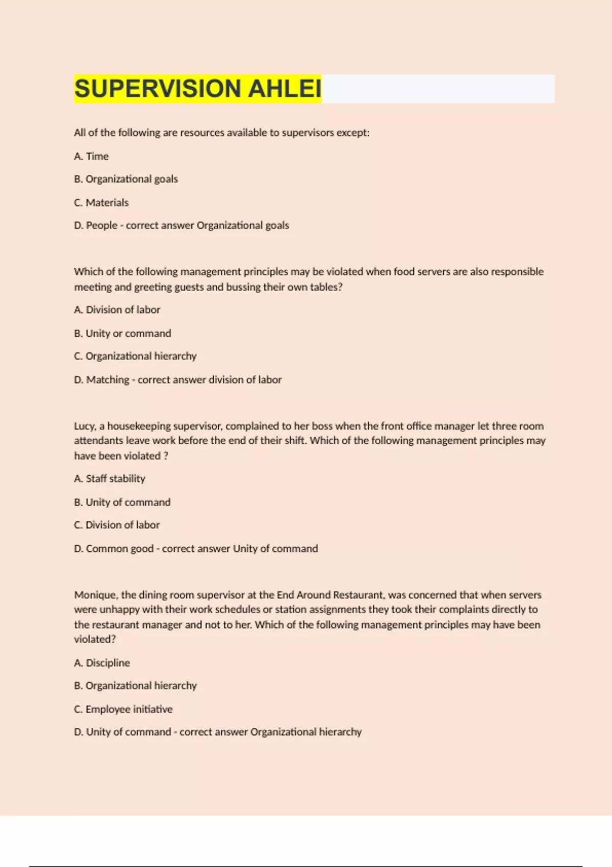 All of the following are resources available to supervisors except: A. Time B. Organizational goals C. Materials D. People Organizational goals Which of the following management principles may be violated when food servers are also responsible meeting and greeting guests and bussing their own tables? A. Division of labor B. Unity or command C. Organizational hierarchy D. Matching division of labor Lucy, a housekeeping supervisor, complained to her boss when the front office manager let three room attendants leave work before the end of their shift. Which of the following management principles may have been violated ? A. Staff stability B. Unity of command C. Division of labor D. Common good Unity of command Monique, the dining room supervisor at the End Around Restaurant, was concerned that when servers were unhappy with their work schedules or station assignments they took their complaints directly to the restaurant manager and not to her. Which of the following management principles may have been violated? A. Discipline B. Organizational hierarchy C. Employee initiative D. Unity of command Organizational hierarchy Which of the following best describes the power that an organization gives to a supervisor to meet organizational goals? A.Responsibility B. Delegation C. Formal authority D. Informal authority Formal authority Elizabeth, the director of sales at the 400- room Benchmark Hotel, delegated to Bill, the reservations manager, the task of changing room rates for all future reservations staff and to the central reservations office. The room rates were never changed. Who should ultimately be responsible? A. Elizabeth, the director of sales B. Bill, the reservations manager C. in-house reservations staff D. the central reservations office Elizabeth, the director of sales Which of the following components of management involves the tasks involved in motivating, training, evaluating, and disciplining employees? A. Controlling B. Directing C. Staffing D. Coordinating Directing