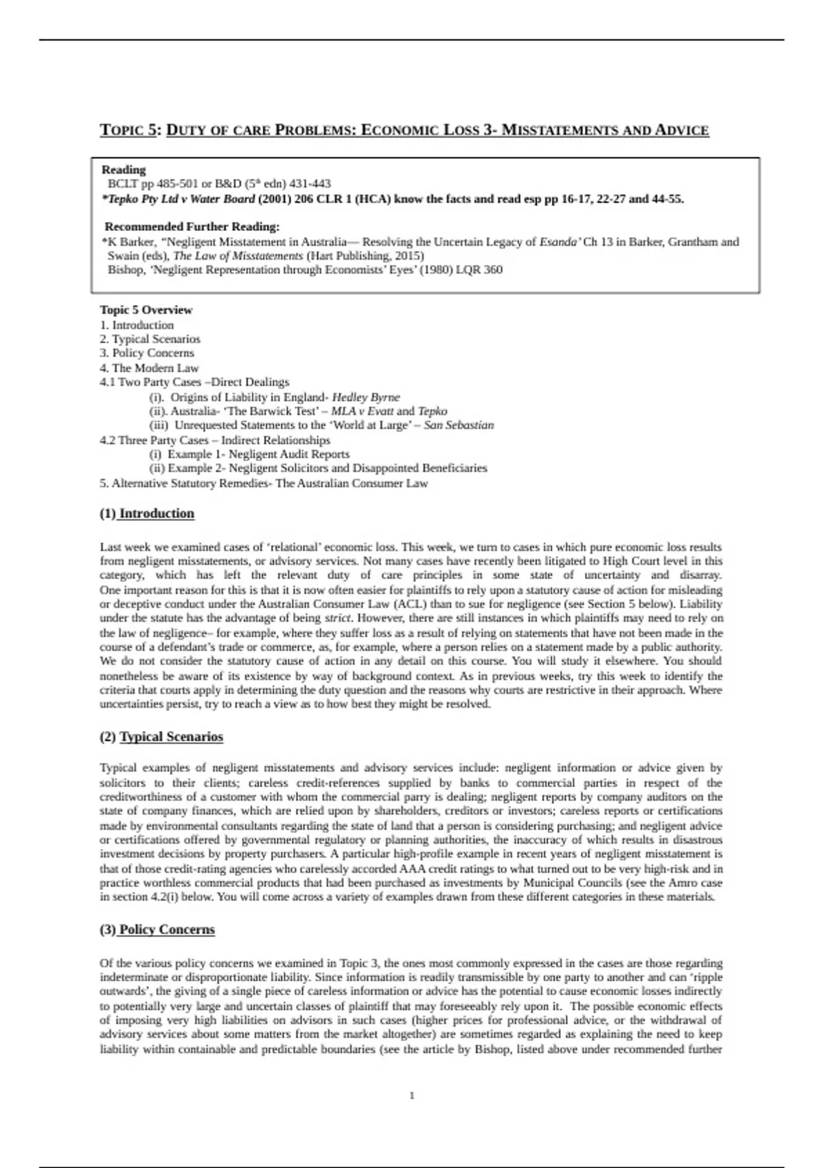 TOPIC 5: DUTY OF CARE PROBLEMS: ECONOMIC LOSS 3- MISSTATEMENTS AND ADVICE Topic 5 Overview 1. Introduction 2. Typical Scenarios 3. Policy Concerns 4. The Modern Law 4.1 Two Party Cases –Direct Dealings (i). Origins of Liability in England- Hedley Byrne (ii). Australia- ‘The Barwick Test’ – MLA v Evatt and Tepko (iii) Unrequested Statements to the ‘World at Large’ – San Sebastian 4.2 Three Party Cases – Indirect Relationships (i) Example 1- Negligent Audit Reports (ii) Example 2- Negligent Solicitors and Disappointed Beneficiaries 5. Alternative Statutory Remedies- The Australian Consumer Law (1) Introduction Last week we examined cases of ‘relational’ economic loss. This week, we turn to cases in which pure economic loss results from negligent misstatements, or advisory services. Not many cases have recently been litigated to High Court level in this category, which has left the relevant duty of care principles in some state of uncertainty and disarray. One important reason for this is that it is now often easier for plaintiffs to rely upon a statutory cause of action for misleading or deceptive conduct under the Australian Consumer Law (ACL) than to sue for negligence (see Section 5 below). Liability under the statute has the advantage of being strict. However, there are still instances in which plaintiffs may need to rely on the law of negligence– for example, where they suffer loss as a result of relying on statements that have not been made in the course of a defendant’s trade or commerce, as, for example, where a person relies on a statement made by a public authority. We do not consider the statutory cause of action in any detail on this course. You will study it elsewhere. You should nonetheless be aware of its existence by way of background context. As in previous weeks, try this week to identify the criteria that courts apply in determining the duty question and the reasons why courts are restrictive in their approach. Where uncertainties persist, try to reach a view as to how best they might be resolved. (2) Typical Scenarios Typical examples of negligent misstatements and advisory services include: negligent information or advice given by solicitors to their clients; careless credit-references supplied by banks to commercial parties in respect of the creditworthiness of a customer with whom the commercial parry is dealing; negligent reports by company auditors on the state of company finances, which are relied upon by shareholders, creditors or investors; careless reports or certifications made by environmental consultants regarding the state of land that a person is considering purchasing; and negligent advice or certifications offered by governmental regulatory or planning authorities, the inaccuracy of which results in disastrous investment decisions by property purchasers. A particular high-profile example in recent years of negligent misstatement is that of those credit-rating agencies who carelessly accorded AAA credit ratings to what turned out to be very high-risk and in practice worthless commercial products that had been purchased as investments by Municipal Councils (see the Amro case in section 4.2(i) below. You will come across a variety of examples drawn from these different categories in these materials. (3) Policy Concerns Of the various policy concerns we examined in Topic 3, the ones most commonly expressed in the cases are those regarding indeterminate or disproportionate liability. Since information is readily transmissible by one party to another and can ‘ripple outwards’, the giving of a single piece of careless information or advice has the potential to cause economic losses indirectly to potentially very large and uncertain classes of plaintiff that may foreseeably rely upon it. The possible economic effects of imposing very high liabilities on advisors in such cases (higher prices for professional advice, or the withdrawal of advisory services about some matters from the market altogether) are sometimes regarded as explaining the need to keep liability within containable and predictable boundaries (see the article by Bishop, listed above under recommended further 1 Reading BCLT pp 485-501 or B&D (5th edn) 431-443 *Tepko Pty Ltd v Water Board (2001) 206 CLR 1 (HCA) know the facts and read esp pp 16-17, 22-27 and 44-55. Recommended Further Reading: *K Barker, “Negligent Misstatement in Australia— Resolving the Uncertain Legacy of Esanda’ Ch 13 in Barker, Grantham and Swain (eds), The Law of Misstatements (Hart Publishing, 2015) Bishop, ‘Negligent Representation through Economists’ Eyes’ (1980) LQR 360 reading). Note, however, that indeterminate and disproportionate liability are not the only concerns that judges refer to in this context. They are also wary of imposing duties of care where this might unduly impinge upon a person’s liberty to speak (especially on social occasions) and they are wary of imposing a tortious duty of care upon an advisor where this might potentially conflict either with the duties he or she owes a client (see eg the Badenach case, below), or with the way in which a statutory regime regulates his or her duties and responsibilities (Caparo Industries v Dickman). Courts have also recently expressed the concern that plaintiffs should take reasonable steps to protect their own economic interests (vulnerability), although, as usual, they are not very helpful in explaining why this should be the case. Notes and Questions: To what extent are courts in the following cases in the materials concerned about: 1. Indeterminate (uncertain) liability? 2. Disproportionate (excessive) liability? 3. Defendant autonomy (freedom to speak) 4. Conflicts between an advisor’s duties to plaintiffs (on the one hand) and their clients (on the other)? 5. Plaintiff vulnerability (reasonable obligations of self-protection)? (4) The Modern Law – When is a Duty Owed? For the purposes of exposition, these materials 