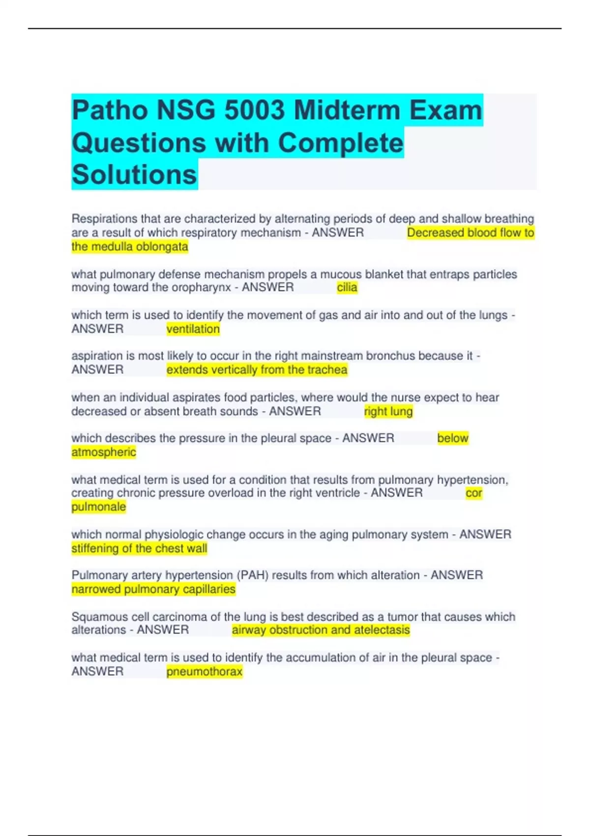 Patho NSG 5003 Midterm Exam Questions with Complete Solutions Respirations that are characterized by alternating periods of deep and shallow breathing are a result of which respiratory mechanism - ANSWER Decreased blood flow to the medulla oblongata what pulmonary defense mechanism propels a mucous blanket that entraps particles moving toward the oropharynx - ANSWER cilia which term is used to identify the movement of gas and air into and out of the lungs - ANSWER ventilation aspiration is most likely to occur in the right mainstream bronchus because it - ANSWER extends vertically from the trachea when an individual aspirates food particles, where would the nurse expect to hear decreased or absent breath sounds - ANSWER right lung which describes the pressure in the pleural space - ANSWER below atmospheric what medical term is used for a condition that results from pulmonary hypertension, creating chronic pressure overload in the right ventricle - ANSWER cor pulmonale which normal physiologic change occurs in the aging pulmonary system - ANSWER stiffening of the chest wall Pulmonary artery hypertension (PAH) results from which alteration - ANSWER narrowed pulmonary capillaries Squamous cell carcinoma of the lung is best described as a tumor that causes which alterations - ANSWER airway obstruction and atelectasis what medical term is used to identify the accumulation of air in the pleural space - ANSWER pneumothorax Fluid in the pleural space characterizes which condition - ANSWER pleural effusion How does chest wall compliance in an infant differ from that of an adult - ANSWER an adult's chest wall compliance is lower than an infants Which statement is true regarding hypoxemia - ANSWER respiratory alterations cause hypoxemia