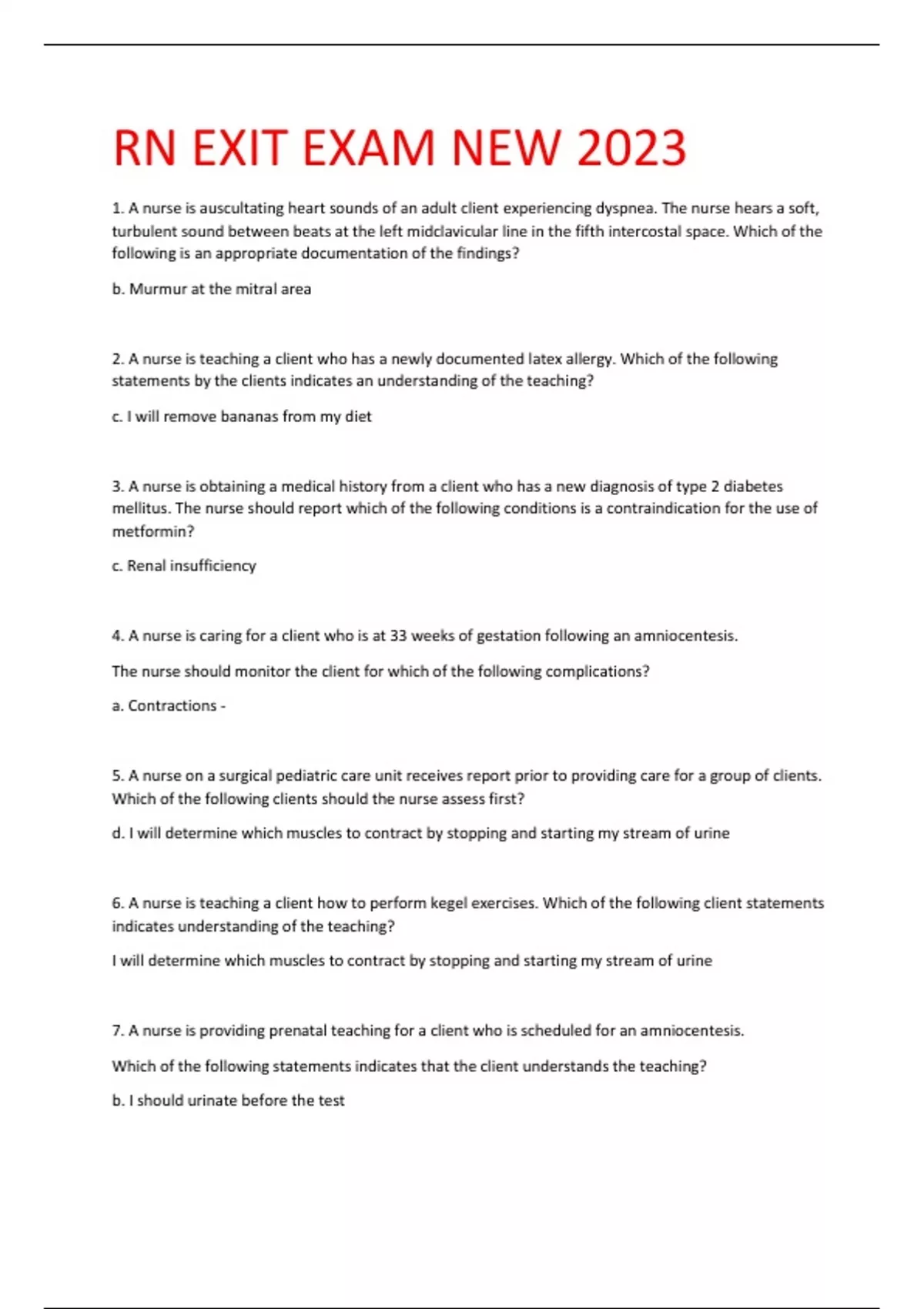 RN EXIT EXAM NEW 2023 1. A nurse is auscultating heart sounds of an adult client experiencing dyspnea. The nurse hears a soft, turbulent sound between beats at the left midclavicular line in the fifth intercostal space. Which of the following is an appropriate documentation of the findings? b. Murmur at the mitral area 2. A nurse is teaching a client who has a newly documented latex allergy. Which of the following statements by the clients indicates an understanding of the teaching? c. I will remove bananas from my diet 3. A nurse is obtaining a medical history from a client who has a new diagnosis of type 2 diabetes mellitus. The nurse should report which of the following conditions is a contraindication for the use of metformin? c. Renal insufficiency 4. A nurse is caring for a client who is at 33 weeks of gestation following an amniocentesis. The nurse should monitor the client for which of the following complications? a. Contractions - 5. A nurse on a surgical pediatric care unit receives report prior to providing care for a group of clients. Which of the following clients should the nurse assess first? d. I will determine which muscles to contract by stopping and starting my stream of urine 6. A nurse is teaching a client how to perform kegel exercises. Which of the following client statements indicates understanding of the teaching? I will determine which muscles to contract by stopping and starting my stream of urine 7. A nurse is providing prenatal teaching for a client who is scheduled for an amniocentesis. Which of the following statements indicates that the client understands the teaching? b. I should urinate before the test 8. A nurse in an emergency department is caring for a client who reports cocaine use 1 hr ago. Which of the following findings should the nurse expect? c. Elevated temperature 9. A nurse is assessing the heart sounds of a client who has acute pericarditis. Which of the following clinical manifestations is an expected finding for this client? b. Scratchy, high pitched sound upon chest auscultation 10. A nurse is providing dietary teaching to a client who has a new diagnosis of irritable bowel syndrome. Which of the following recommendations should the nurse include? b. Consume food high in bran fiber 11. A nurse is admitting an older adult client who is transferring from another facility. The nurse notes pressure ulcers on the client’s coccyx and abrasions around the wrists. Which of the following actions should the nurse take to address the suspicions of elder abuse? b. Privately interview the client about her condition. 12. A nurse is caring for a client following a stroke. The client has right-sided weakness and facial drooping. Which of the following nursing actions is the priority? a. Maintain NPO status for client(ABC) 13. A community health nurse is teaching a client who has type 1 diabetes mellitus and is 10 weeks of gestation about managing diabetes during pregnancy. Which of the following statements by the client indicates an understanding of the teaching? b. “I will need to increase my insulin doses later in my pregnancy” 14. A home health nurse is preparing to assess a client who reports tingling around the mouth and laxative use at least once daily. Which of the following assessments should the nurse perform first? a. Test the client for Trousseau’s sign 15. A nurse is teaching a client who has an ileostomy about the care of his stoma site. Which of the following statements by the client requires further teaching? c. “I should change the stoma pouch every day” 16. A nurse is assessing a client who is receiving magnesium sulfate by continuous IV infusion. Which of the following findings should the nurse recognize as a result of magnesium sulfate toxicity? a. Hyporeflexia 17.A nurse is planning to administer ampicillin 100 mg/kg/day in divided doses every 12 hours to a newborn who weighs 4.34 kg(9.5 lbs). Available is ampicillin 125mg/ml. How many milliliters should the nurse administer per dose? ( Round the answer to the nearest tenth. Use a leading zero if it applies. Do not use a trailing zero) Answer is 1.7 mL per dose Rationale: 100mg X 4.34 kg= 434 mg/day 434mg/125mgX1=3.472/day 3.472/2= 1.736 18.A nurse is caring for a client who asks for information regarding organ donation. Which of the following responses should the nurse make? a. “Your desire to be an organ donor must be documented in writing” 19.A nurse is admitting a client who has acute heart failure. Which of the following prescriptions from the provider should the nurse anticipate? a. Administer enalapril 2.5 mg PO twice daily 20.A nurse is collecting a specimen for urinalysis and culture from a client who has an indwelling urinary catheter. Which of the following actions should the nurse take during collection? b. Clamp the catheter distal to the injection port 21. A nurse is caring for a client who reports diarrhea for 3 days. The nurse should monitor the client for which of the following manifestations? A. Orthostatic Hypertension 22. A nurse is devdeloping an in-service about personality disorders. Which of the following information should the nurse include when discussing borderline personality disorder? B. The client exhibits impulsive behavior. 23. A nurse is assessing a client who is 36 weeks of gestation. Which of the following findings should the nurse report to the provider? B. Protruding Hemorrhoids 24. A nurse is administering an analgesic to a client who has a chest tube. The provider is preparing to discontinue the chest tube before the medication has taken affect. Which of the following actions should the nurse prepare to take first? A. Inform the provider of the time of the last dose of pain medication. 25. A nurse in a PACU is transferring care of a client to a nurse on the medical-surgical unit. Which of the following statements should the nurse include in the hand-off report? B. The estimated blood loss was 250 milliliters. 26. A nurse is provid