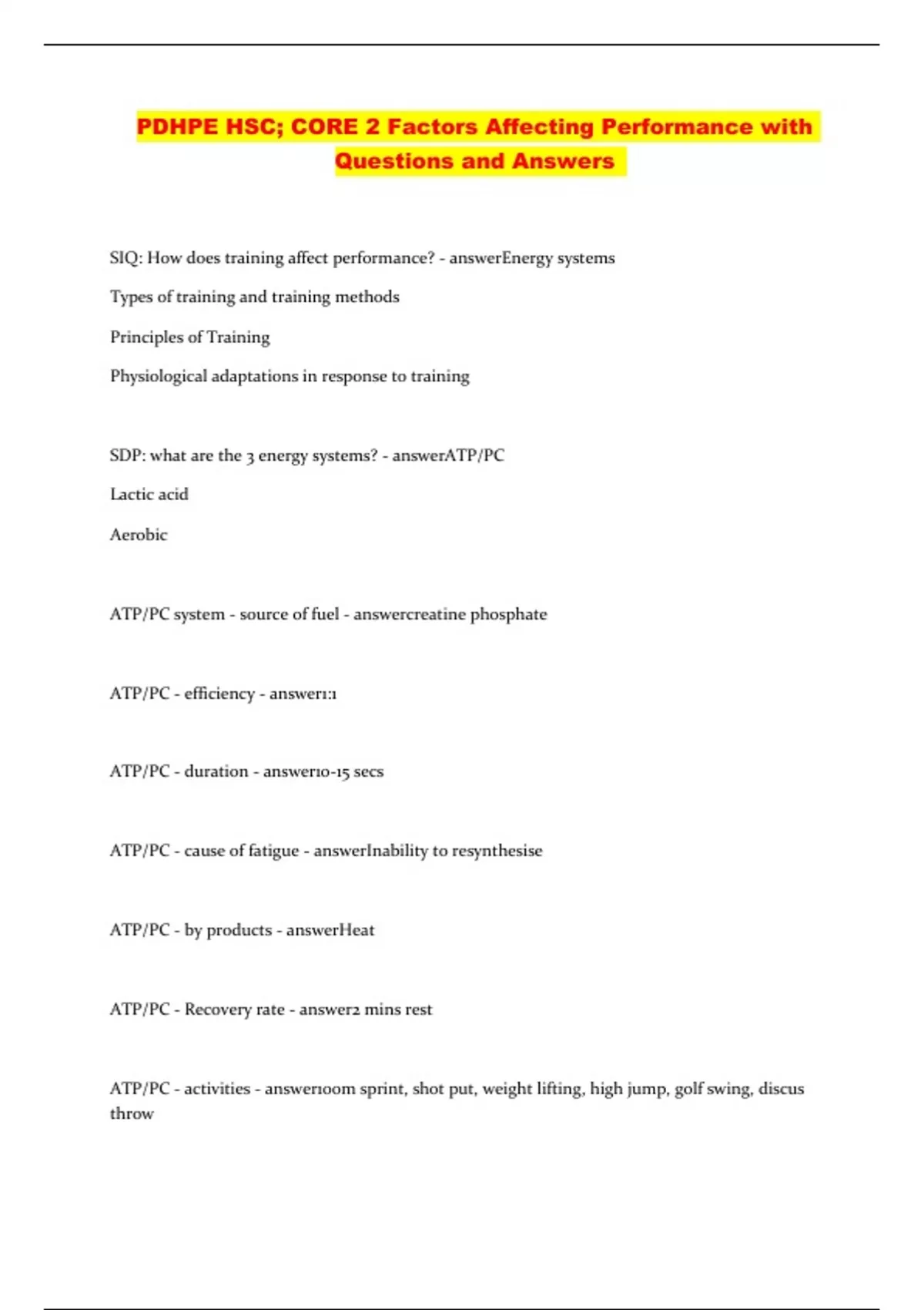PDHPE HSC; CORE 2 Factors Affecting Performance with Questions and Answers SIQ: How does training affect performance? - answerEnergy systems Types of training and training methods Principles of Training Physiological adaptations in response to training SDP: what are the 3 energy systems? - answerATP/PC Lactic acid Aerobic ATP/PC system - source of fuel - answercreatine phosphate ATP/PC - efficiency - answer1:1 ATP/PC - duration - answer10-15 secs ATP/PC - cause of fatigue - answerInability to resynthesise ATP/PC - by products - answerHeat ATP/PC - Recovery rate - answer2 mins rest ATP/PC - activities - answer100m sprint, shot put, weight lifting, high jump, golf swing, discus throw Lactic acid system - source of fuel - answercarbohydrates and glycogen Lactic acid system - efficiency - answerFast, 1:2, anaerobic glycolysis Lactic acid system - duration - answer10 secs - 4 mins (intensity dependent) Lactic acid system - cause of fatigue - answerLactic Acid build up, 'burn' (H+ ion build up acidosis in working muscle) Lactic acid system - by products - answerLactate Lactic acid system - recovery rate - answer30 mins - 2 hours, lactate removal. If insufficient oxygen is available to the working muscles, the pyruvate binds to pH-decreasing hydrogen atoms, forming lactate --> transported to the liver to be metabolised and converted back into glycogen. Lactic acid system - activities - answer800m run, 200m swim What is anaerobic glycolysis? - answerGlycogen --> glucose --> glucose broken down --> releases energy for ATP resynthesis of 2 ATP + by product pyruvate. Aerobic system - source of fuel - answercarbohydrates( when intensity increases towards and above 70% of max HR), fat (when at rest), protein (in extreme cases when both other stores are depleted) Aerobic system - efficiency - answerSlow, 1:36, when using fat as the fuel, yield is even greater, >400 ATP (however this requires excessive oxygen, so usually used at rest)