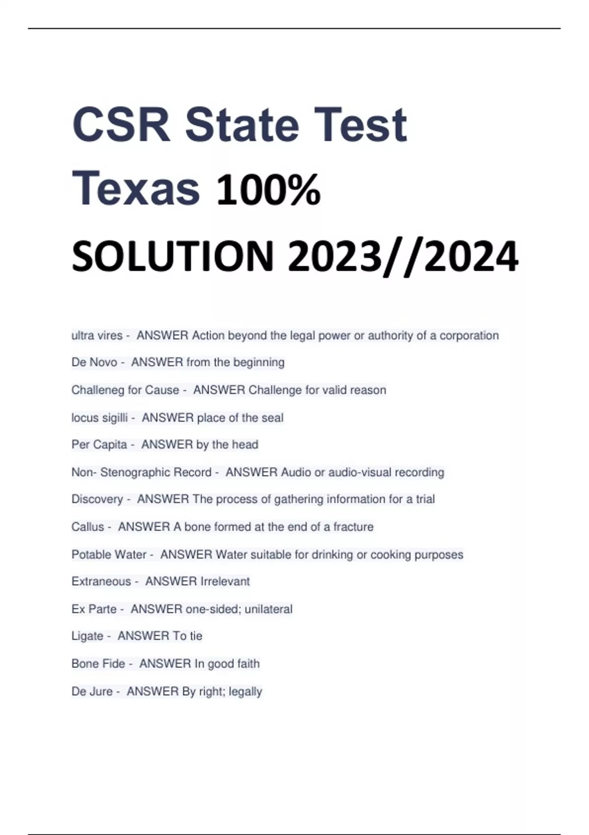 CSR State Test Texas 100% SOLUTION 2023//2024 ultra vires - ANSWER Action beyond the legal power or authority of a corporation De Novo - ANSWER from the beginning Challeneg for Cause - ANSWER Challenge for valid reason locus sigilli - ANSWER place of the seal Per Capita - ANSWER by the head Non- Stenographic Record - ANSWER Audio or audio-visual recording Discovery - ANSWER The process of gathering information for a trial Callus - ANSWER A bone formed at the end of a fracture Potable Water - ANSWER Water suitable for drinking or cooking purposes Extraneous - ANSWER Irrelevant Ex Parte - ANSWER one-sided; unilateral Ligate - ANSWER To tie Bone Fide - ANSWER In good faith De Jure - ANSWER By right; legally Sui Generis - ANSWER of its own kind Ergo - ANSWER Therefore Impleader - ANSWER another name for third-party lawsuits Judicial Notice - ANSWER Recognition which a judge takes of some fact without evidence Prima Facie - ANSWER at first glance Germane - ANSWER relevant Spasm - ANSWER involuntary muscle contraction Circa - ANSWER about De Facto - ANSWER in fact In Curia - ANSWER In court Corpus Delicti - ANSWER body of the crime Et Vir - ANSWER Latin for "and husband" Ex Ux - ANSWER and wife Official Court Reporter or Deputy Official Court Reporter - ANSWER CSR appointed by a judge as the Official Court Reporter Master Index - ANSWER Compilation of an official's record Margin - ANSWER Space around the text on a page Motion in Limine - ANSWER A motion made at the beginning of the trial Compressed - ANSWER Format has been reduced & printed into two or four normal sized pages on one 8 1/2 x 11- inch page ASCII Format - ANSWER American Standard Code for Information Interchange Amicus Curiae - ANSWER friend of the court Bell's Palsy - ANSWER Affects the 7th cranial nerve in face GERD - ANSWER Gastroesophageal Reflux Diseas