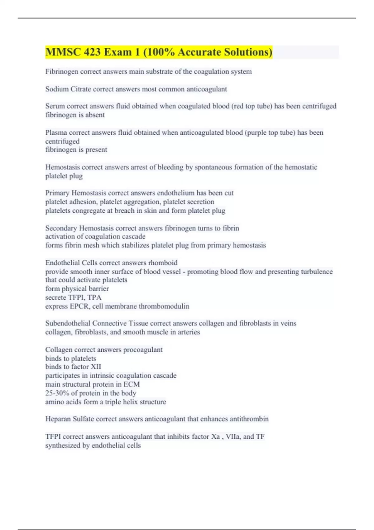 Fibrinogen correct answers main substrate of the coagulation system Sodium Citrate correct answers most common anticoagulant Serum correct answers fluid obtained when coagulated blood (red top tube) has been centrifuged fibrinogen is absent Plasma correct answers fluid obtained when anticoagulated blood (purple top tube) has been centrifuged fibrinogen is present Hemostasis correct answers arrest of bleeding by spontaneous formation of the hemostatic platelet plug Primary Hemostasis correct answers endothelium has been cut platelet adhesion, platelet aggregation, platelet secretion platelets congregate at breach in skin and form platelet plug Secondary Hemostasis correct answers fibrinogen turns to fibrin activation of coagulation cascade forms fibrin mesh which stabilizes platelet plug from primary hemostasis Endothelial Cells correct answers rhomboid provide smooth inner surface of blood vessel - promoting blood flow and presenting turbulence that could activate platelets form physical barrier secrete TFPI, TPA express EPCR, cell membrane thrombomodulin Subendothelial Connective Tissue correct answers collagen and fibroblasts in veins collagen, fibroblasts, and smooth muscle in arteries Collagen correct answers procoagulant binds to platelets binds to factor XII participates in intrinsic coagulation cascade main structural protein in ECM 25-30% of protein in the body amino acids form a triple helix structure Heparan Sulfate correct answers anticoagulant that enhances antithrombin TFPI correct answers anticoagulant that inhibits factor Xa , VIIa, and TF synthesized by endothelial cells