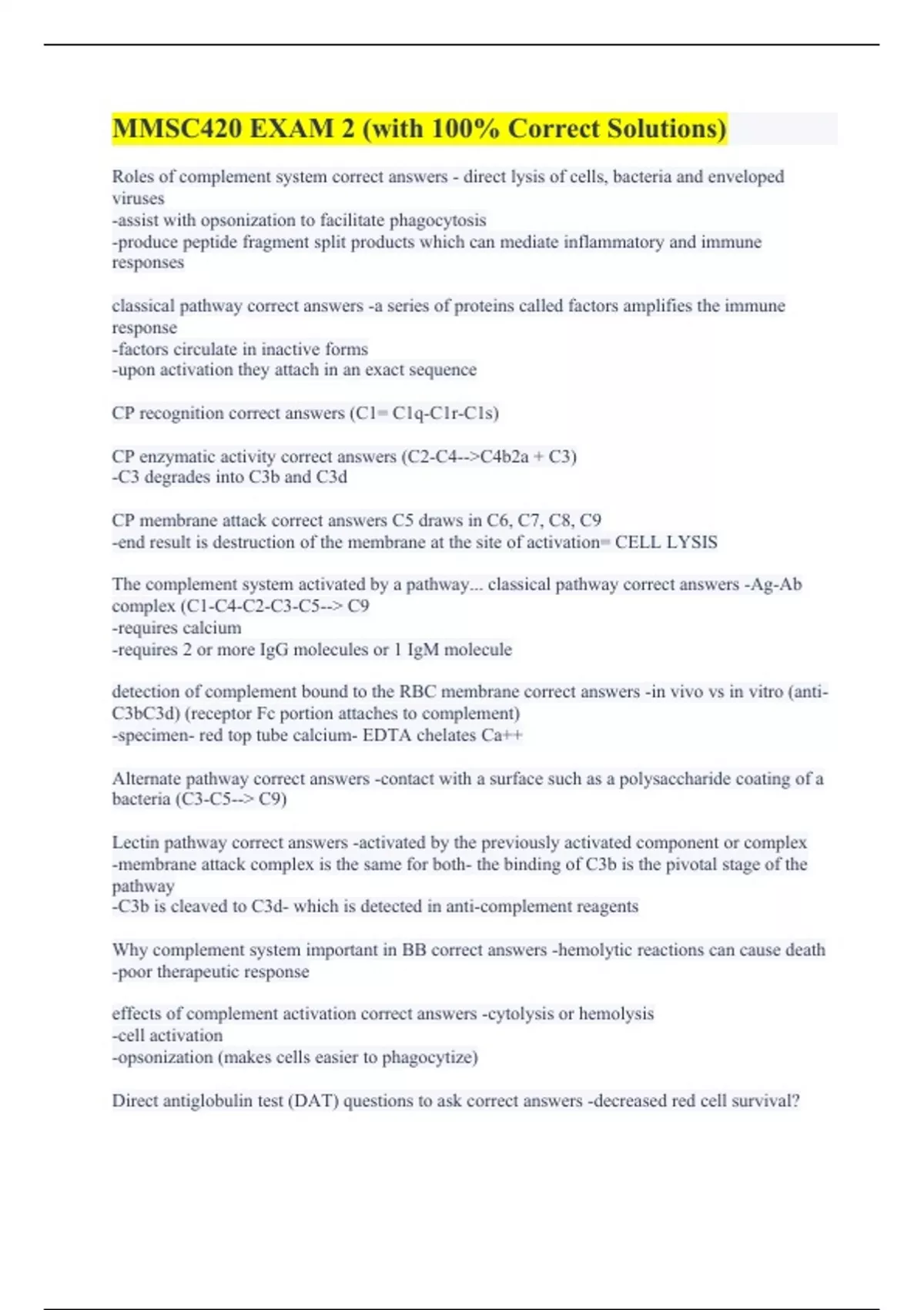 Roles of complement system correct answers - direct lysis of cells, bacteria and enveloped viruses -assist with opsonization to facilitate phagocytosis -produce peptide fragment split products which can mediate inflammatory and immune responses classical pathway correct answers -a series of proteins called factors amplifies the immune response -factors circulate in inactive forms -upon activation they attach in an exact sequence CP recognition correct answers (C1= C1q-C1r-C1s) CP enzymatic activity correct answers (C2-C4--C4b2a + C3) -C3 degrades into C3b and C3d CP membrane attack correct answers C5 draws in C6, C7, C8, C9 -end result is destruction of the membrane at the site of activation= CELL LYSIS The complement system activated by a pathway... classical pathway correct answers -Ag-Ab complex (C1-C4-C2-C3-C5-- C9 -requires calcium -requires 2 or more IgG molecules or 1 IgM molecule detection of complement bound to the RBC membrane correct answers -in vivo vs in vitro (anti-C3bC3d) (receptor Fc portion attaches to complement) -specimen- red top tube calcium- EDTA chelates Ca++ Alternate pathway correct answers -contact with a surface such as a polysaccharide coating of a bacteria (C3-C5-- C9) Lectin pathway correct answers -activated by the previously activated component or complex -membrane attack complex is the same for both- the binding of C3b is the pivotal stage of the pathway -C3b is cleaved to C3d- which is detected in anti-complement reagents Why complement system important in BB correct answers -hemolytic reactions can cause death -poor therapeutic response effects of complement activation correct answers -cytolysis or hemolysis -cell activation -opsonization (makes cells easier to phagocytize) Direct antiglobulin test (DAT) questions to ask correct answers -decreased red cell survival?