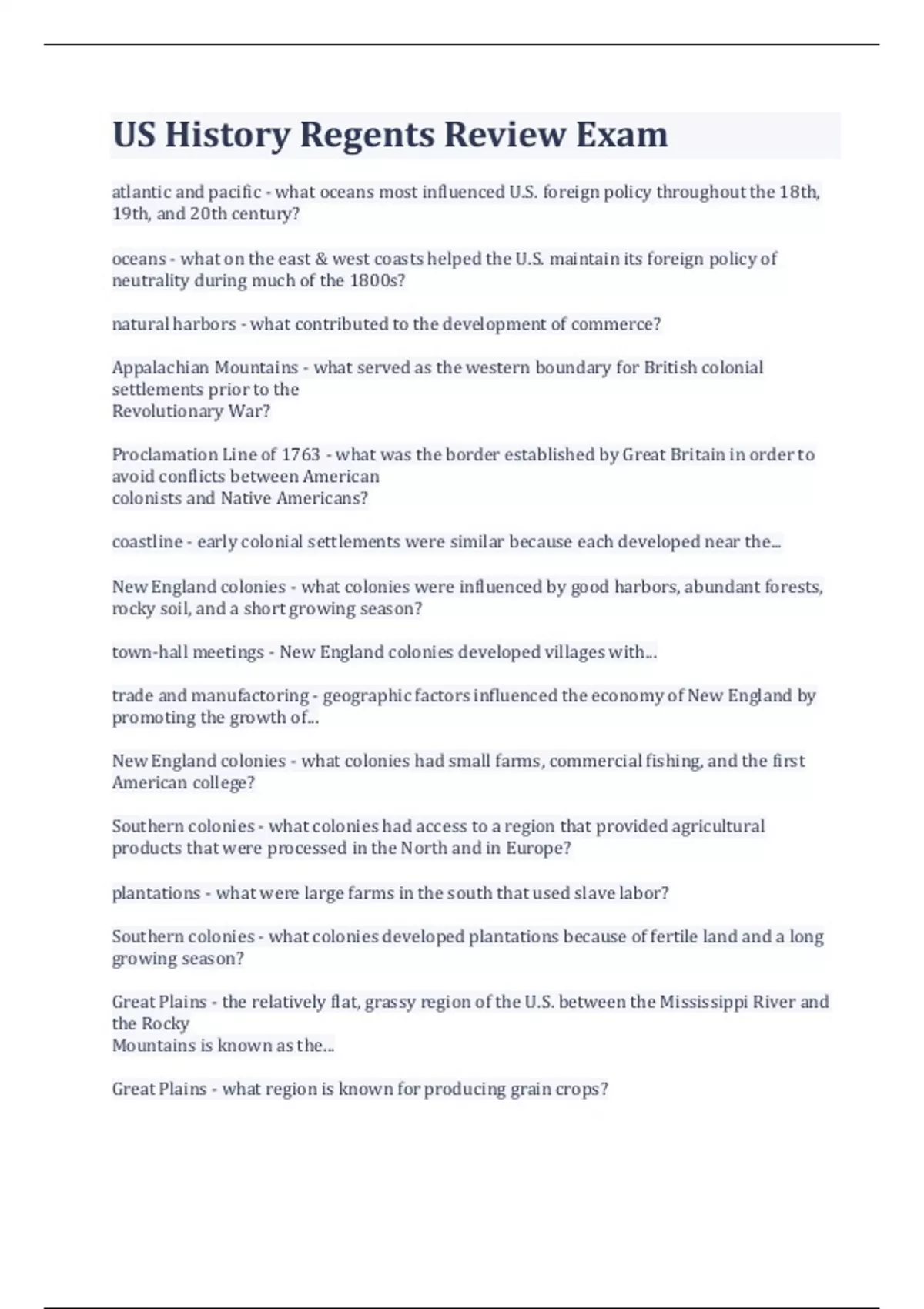 US History Regents Review Exam atlantic and pacific - what oceans most influenced U.S. foreign policy throughout the 18th, 19th, and 20th century? oceans - what on the east & west coasts helped the U.S. maintain its foreign policy of neutrality during much of the 1800s? natural harbors - what contributed to the development of commerce? Appalachian Mountains - what served as the western boundary for British colonial settlements prior to the Revolutionary War? Proclamation Line of 1763 - what was the border established by Great Britain in order to avoid conflicts between American colonists and Native Americans? coastline - early colonial settlements were similar because each developed near the... New England colonies - what colonies were influenced by good harbors, abundant forests, rocky soil, and a short growing season? town-hall meetings - New England colonies developed villages with... trade and manufactoring - geographic factors influenced the economy of New England by promoting the growth of... New England colonies - what colonies had small farms, commercial fishing, and the first American college? Southern colonies - what colonies had access to a region that provided agricultural products that were processed in the North and in Europe? plantations - what were large farms in the south that used slave labor? Southern colonies - what colonies developed plantations because of fertile land and a long growing season? Great Plains - the relatively flat, grassy region of the U.S. between the Mississippi River and the Rocky Mountains is known as the... Great Plains - what region is known for producing grain crops? Triangular Trade - what led directly to the increased importation of enslaved Africans to the Western Hemisphere (colonies)? British mercantilism - what was the economic policy used by the British in which the American Colonies served as a source of raw materials and a market to sell goods? trade - British mercantilism limited colonies ability to do what with other nations? salutary neglect - what was the period of time when the British ignored the colonies because they only wanted to benefit from the economic prosperity of the colonies independent - salutary neglect let to the development of _____________ colonial trade practices French and Indian War - what war was caused by disputed land claims in the Ohio River valley between the French and the British (the French and Indians were on the same side)? French and Indian War - what war led to the end of the period of Salutary Neglect? self-government - the Virginia House of Burgesses, the Mayflower Compact, and town hall meetings were all early colonial efforts in what? representative democracy - the colonies' efforts in self-government all contributed to the development of _______________ ____________ Albany Plan of Union - what was the early attempt to unify American colonies in 1754 but under British rule? individual power - many colonies objected to the Albany Plan of Union because colonial assemblies did not want to give up their __________________ ____________ Declaration of Independence - what was the document that listed the grievances the colonies felt against British rule and reasons for separating from Great Britain? Thomas Jefferson - who wrote the Declaration of Independence? Enlightenment writers - who was Thomas Jefferson most influenced by? democratic principles - the Declaration of Independence is described as a statement of _________________ __________ rather than a framework for government John Locke - which Enlightenment thinker, who inspired Jefferson, had the theory of natural rights and that the power to govern belonged to the people? social contract theory of government - the statement in the Declaration of Independence that said the fundamental purpose of government is to secure the natural rights of the people is known as the... no taxation without representation - many colonists believed they could not be taxed by the British because they had no representatives in the British government consent of the governed - the colonies had no representatives in the British government, which means that the British did not have...... Thomas Paine - who published Common Sense? Common Sense - what was influential in persuading American colonists to support colonial independence from Britain? mercantilist policies - the Committees of Correspondence, Non-importation Agreements, Boston Tea Party, and First Continental Congress were all responses to the... Sugar and Stamp Acts - what British imposed acts taxed foreign molasses and printed material? Quartering Act - what British imposed act required colonists to house and feed British soldiers? Townshend Acts - what British imposed act taxed imported goods and tea? Boston Massacre - five people were killed by British soldiers at the... Revolutionary War - what began shortly after the signing of the Declaration of Independence? France - american colonies won the war and independence with the help of familiar land and aid from which foreign country? the Mississippi - at the end of the Revolutionary War, what became the western boundary of the U.S.? Articles of Confederation - what was the first form of government used by the U.S. after independence from Britain? union - the Articles of Confederation was the first plan of _________ for the original 13 colonies strong central government - after the war, many Americans distrusted a ___________ ______________ ________________ because of their experiences under the rule of Great Britain state governments - the Articles of Confederation was largely unsuccessful at solving many major problems because most power remained with the.... Constitutional Convention - the event in 1787 where major American delegates met in Philadelphia to revise the weaknesses of the Articles of Confederation was called the... Shays' Rebellion - what rebellion in 1786 convinced many Americans of the need for a stronger national government, exposed the weakne