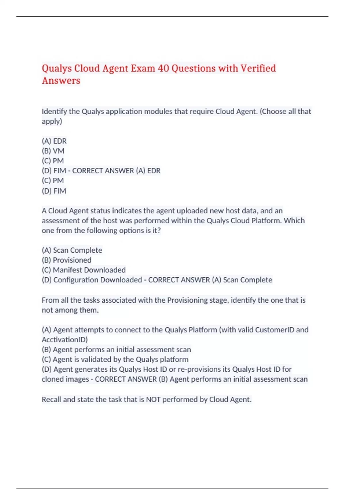 Qualys Cloud Agent Exam 40 Questions with Verified Answers,100% CORRECT