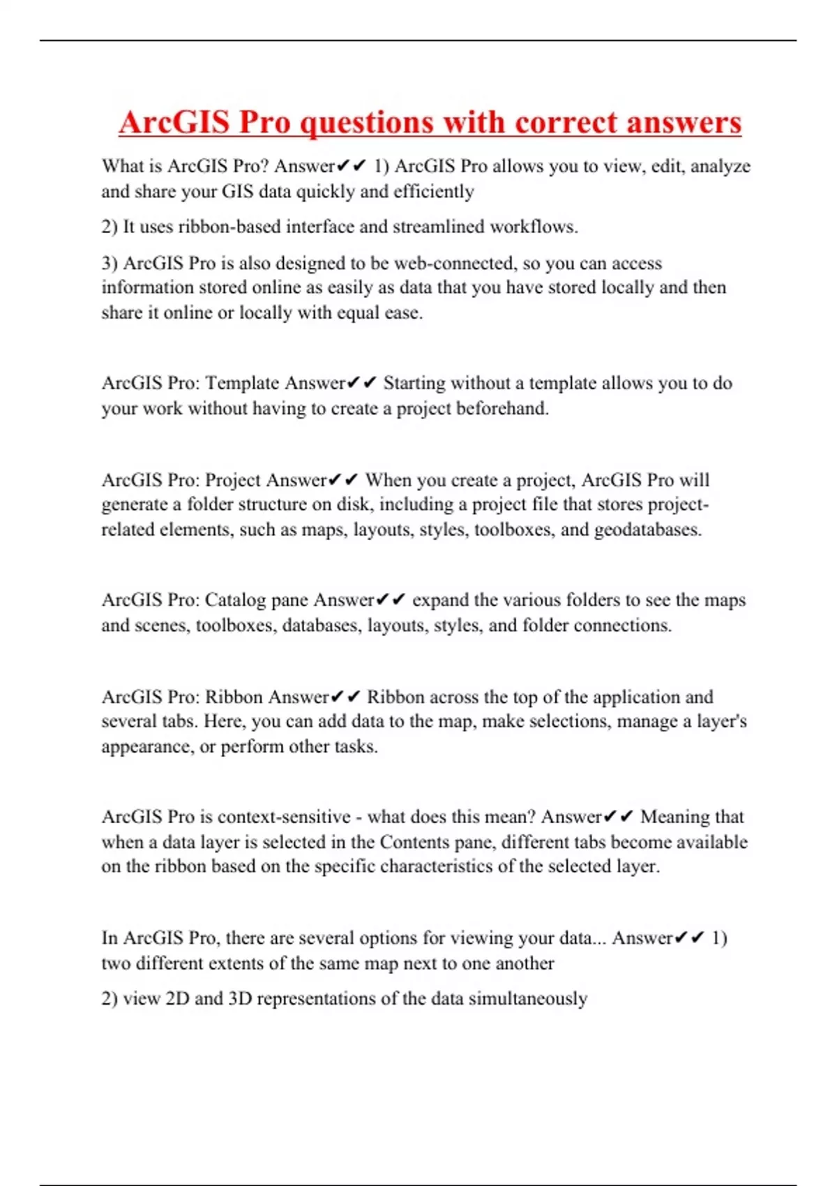 What is ArcGIS Pro? Answer 1) ArcGIS Pro allows you to view, edit, analyze and share your GIS data quickly and efficiently 2) It uses ribbon-based interface and streamlined workflows. 3) ArcGIS Pro is also designed to be web-connected, so you can access information stored online as easily as data that you have stored locally and then share it online or locally with equal ease. ArcGIS Pro: Template Answer Starting without a template allows you to do your work without having to create a project beforehand. ArcGIS Pro: Project Answer When you create a project, ArcGIS Pro will generate a folder structure on disk, including a project file that stores project-related elements, such as maps, layouts, styles, toolboxes, and geodatabases. ArcGIS Pro: Catalog pane Answer expand the various folders to see the maps and scenes, toolboxes, databases, layouts, styles, and folder connections. ArcGIS Pro: Ribbon Answer Ribbon across the top of the application and several tabs. Here, you can add data to the map, make selections, manage a layer's appearance, or perform other tasks.