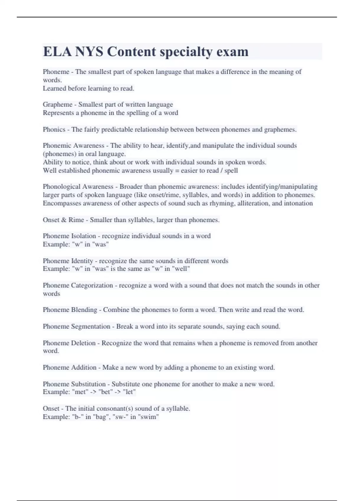 ELA NYS Content specialty exam Phoneme - The smallest part of spoken language that makes a difference in the meaning of words. Learned before learning to read. Grapheme - Smallest part of written language Represents a phoneme in the spelling of a word Phonics - The fairly predictable relationship between between phonemes and graphemes. Phonemic Awareness - The ability to hear, identify,and manipulate the individual sounds (phonemes) in oral language. Ability to notice, think about or work with individual sounds in spoken words. Well established phonemic awareness usually = easier to read / spell Phonological Awareness - Broader than phonemic awareness: includes identifying/manipulating larger parts of spoken language (like onset/rime, syllables, and words) in addition to phonemes. Encompasses awareness of other aspects of sound such as rhyming, alliteration, and intonation Onset & Rime - Smaller than syllables, larger than phonemes. Phoneme Isolation - recognize individual sounds in a word Example: "w" in "was" Phoneme Identity - recognize the same sounds in different words Example: "w" in "was" is the same as "w" in "well" Phoneme Categorization - recognize a word with a sound that does not match the sounds in other words Phoneme Blending - Combine the phonemes to form a word. Then write and read the word. Phoneme Segmentation - Break a word into its separate sounds, saying each sound. Phoneme Deletion - Recognize the word that remains when a phoneme is removed from another word. Phoneme Addition - Make a new word by adding a phoneme to an existing word. Phoneme Substitution - Substitute one phoneme for another to make a new word. Example: "met" -> "bet" -> "let" Onset - The initial consonant(s) sound of a syllable. Example: "b-" in "bag", "sw-" in "swim" Rime - The part of a syllable that contains the vowel and all that follows it Example: "-ag" in "bag", "-im" in "swim" Rhyme - repetition of similar sounds in the final stressed syllables and any following syllables of two or more words Alliteration - Repeated initial sound in a word. Ex) Wild Wedneseday Was Weird Intonation - The rise and fall in the voice when speaking How phonemic awareness instruction helps learn reading - How phonemic awareness instruction helps learn spelling - When is phonemic awareness most effective? - When children are taught to manipulate phonemes by using letters of the alphabet. Teaching sounds along with letters helps students relate phonemic awareness to reading/writing. When it focuses on only one or two types of phoneme manipulation. Systematic Phonics Instruction - The direct teaching of a set of letter-sound relationships in a clearly defined sequence. Includes major sound/spelling relationships of consonants and vowels. Greatest impact on early learner's reading achievement and comprehension. Fluency - Bridge between word recognition and comprehension. Read accurately, quickly, and with expression. Modeled by read alouds.