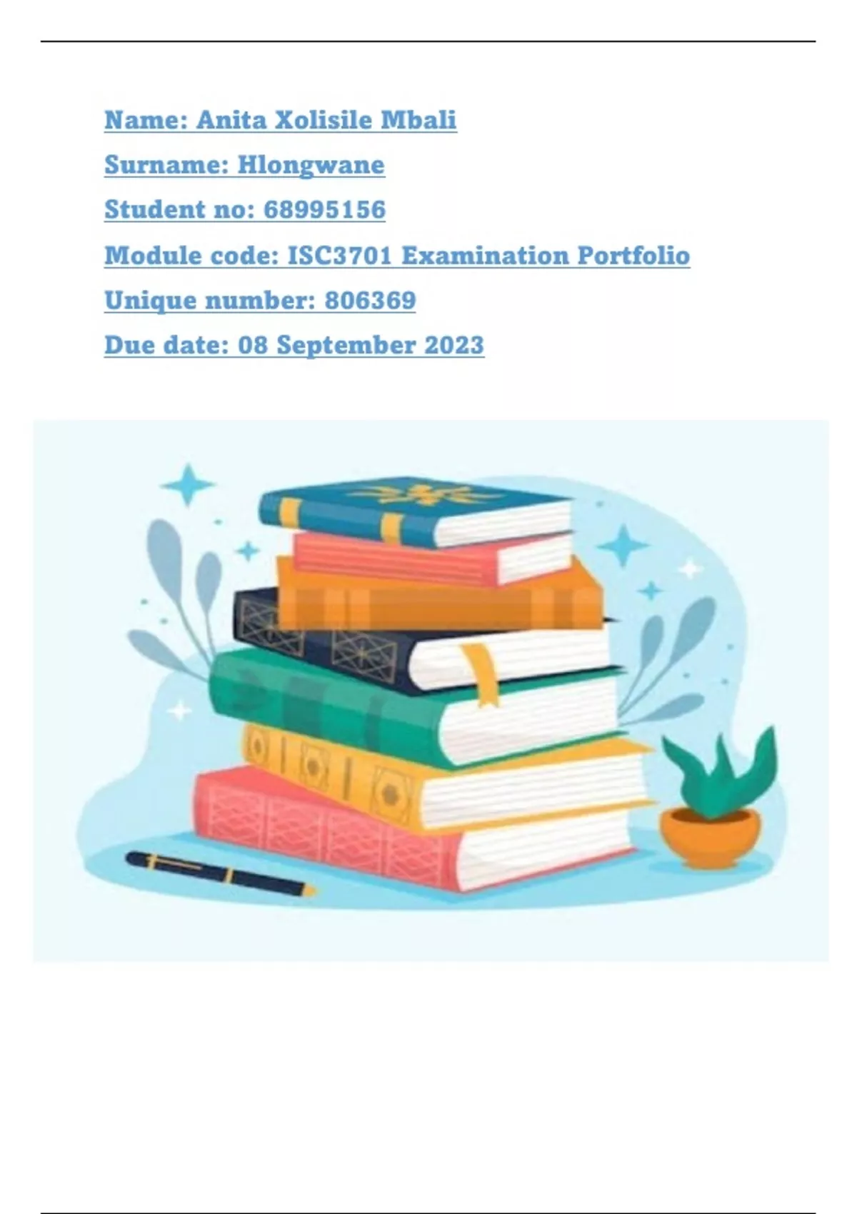 Well-structured ISC3701 PORTFOLIO Assignment 4 (ANSWERS) 2023 ()- DISTINCTION GUARANTEED (DETAILED ANSWERS - DISTINCTION GUARANTEED!). YOUR PORTFOLIO MUST INCLUDE THE FOLLOWING: This section requires the students to demonstrate basic skills such as organising the work by including the table of content; some of the skills are required for future teachers. This section will also assist the reader/marker in understanding your readiness and competence to be a teacher. 1. A cover page (neat and well-designed). 2. A table of contents (TOC) (2) 3. A short biography to introduce yourself to the reader (max 100 words). (3) 4. A teaching statement describing your teaching beliefs, practices, and learning process (300 words). (10) A. MARKED ASSIGNMENTS 1.1 Write your reflections on the 2023 marked assignments, discussions, and interactions between you as the student & the module lecturer.