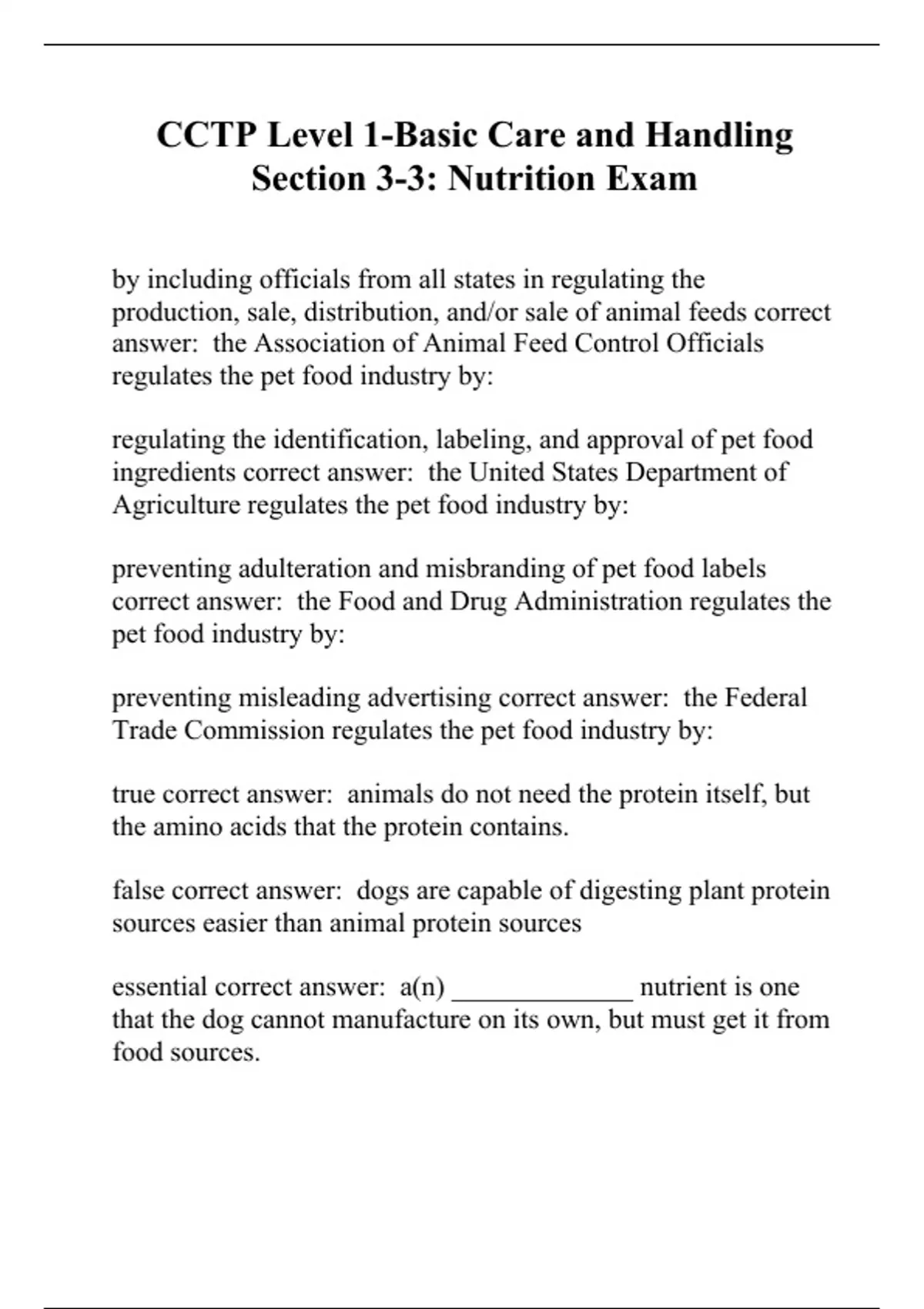 CCTP Level 1-Basic Care and Handling Section 3-3: Nutrition Exam