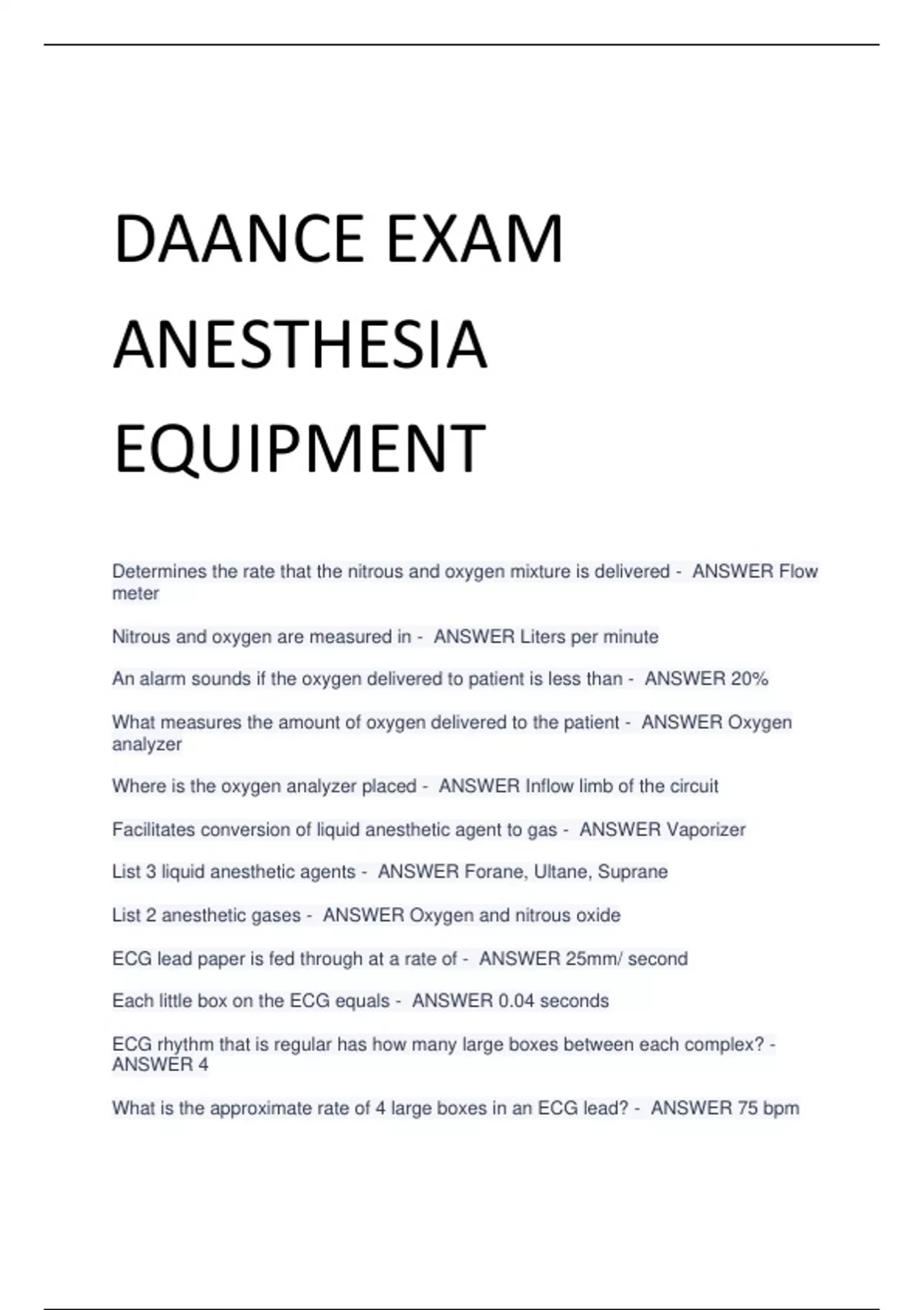 DAANCE EXAM 2023 with correct answers-ANESTHESIA EQUIPMENT Determines the rate that the nitrous and oxygen mixture is delivered - ANSWER Flow meter Nitrous and oxygen are measured in - ANSWER Liters per minute An alarm sounds if the oxygen delivered to patient is less than - ANSWER 20% What measures the amount of oxygen delivered to the patient - ANSWER Oxygen analyzer Where is the oxygen analyzer placed - ANSWER Inflow limb of the circuit Facilitates conversion of liquid anesthetic agent to gas - ANSWER Vaporizer List 3 liquid anesthetic agents - ANSWER Forane, Ultane, Suprane List 2 anesthetic gases - ANSWER Oxygen and nitrous oxide ECG lead paper is fed through at a rate of - ANSWER 25mm/ second Each little box on the ECG equals - ANSWER 0.04 seconds ECG rhythm that is regular has how many large boxes between each complex? - ANSWER 4 What is the approximate rate of 4 large boxes in an ECG lead? - ANSWER 75 bpm Each large box represents how many seconds? - ANSWER .20 How do you do maintenance on the Vaporizer? - ANSWER Calibrate What breathes for the patient with a bellows apparatus with positive and negative pressure? - ANSWER Ventilator This absorbs excess carbon dioxide - ANSWER Sodasorb (soda lime canister) Each small box on an ECG is how high? - ANSWER 1mm in height Each large box on an ECG is how high? - ANSWER .5mm in height Each 5 large boxes on an ECG represents how many seconds? - ANSWER 1 Most anesthesia machines will do what when the oxygen delivery system is below a safe level of 22% - ANSWER Stop delivering nitrous or other gases When excess gas and vapors are expelled into the OR from the anesthesia machine what is used to exhaust them from the room? - ANSWER Scavenging System What are the correct colors for anesthetic gas cylinders? - ANSWER 1. Green - Oxygen 2. Nitrous - Blue 3. Carbon Dioxide - Gray 4. Compressed air - Yellow 5. Helium - Brown A full oxygen tank reads how many psi's? - ANSWER 2000 A full nitrous tank reads how many psi's? - ANSWER 750 What is performed after all other conventional methods of establishing an airway with obstruction? - ANSWER Cricothyrotomy A bluish tinge to the skin, mucus membranes, and nail beds is called - ANSWER Cyanosis What type of drug alters the physiologic state of the patient - ANSWER Analgesic What is an Analgesic - ANSWER Pain medication Determines the oxygenation of the hemoglobin and displays the ratio of oxygenated